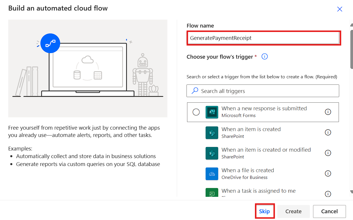 Scenario: This Power Automate flow triggers when a new record is added to the Dataverse. It retrieves the data from the record, generates an HTML document with the relevant information, converts it to a PDF, and stores it in OneDrive. Finally, the PDF is sent as an email attachment to the specified recipient.