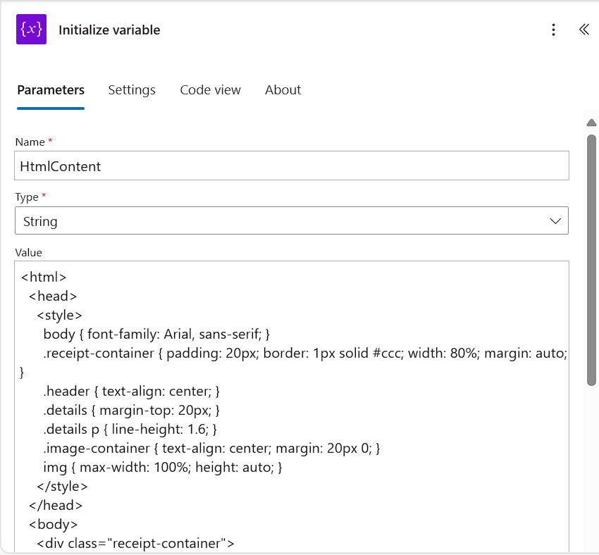 Set up an Initialize Variable step to store any data you need to dynamically insert into the PDF file. Add html and CSS code in the values.