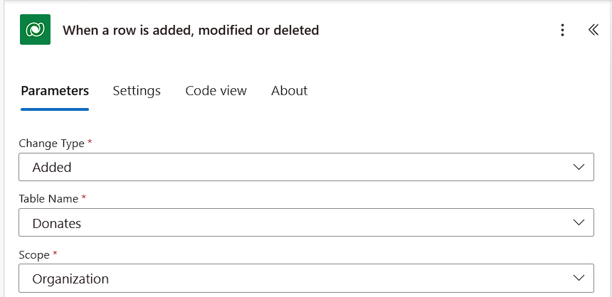 Then, add a Microsoft Dataverse trigger (When a row is added, modified, or deleted), and select the change type, table name, and scope.