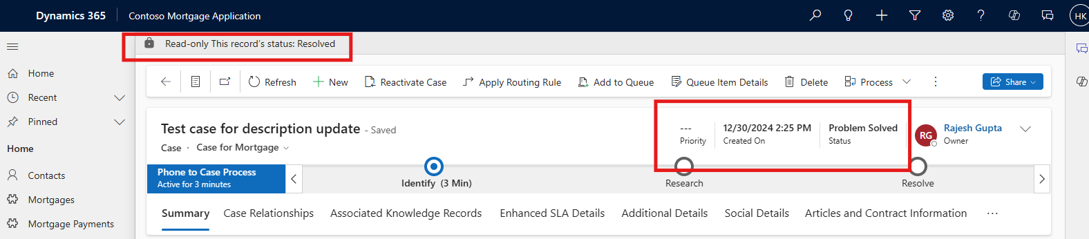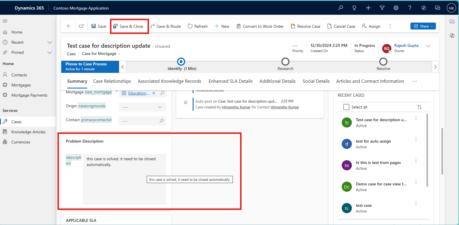 To test this automation, go to an unresolved case, update its description, and save. The flow will run automatically, and you should see the result with the case status changed to "Resolved."