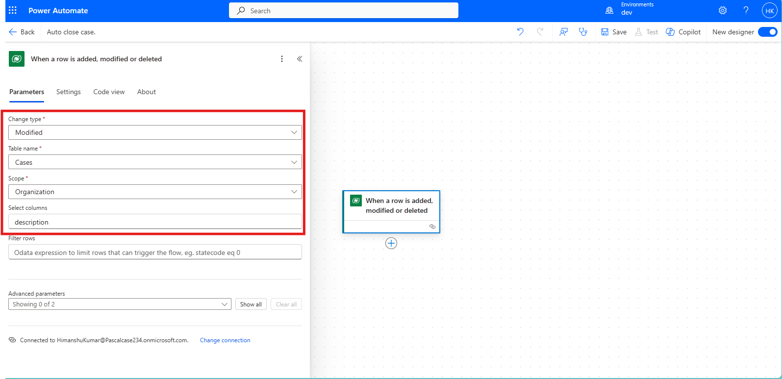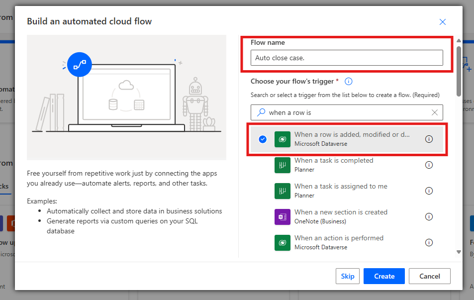 Enter the name of the flow and select the trigger “When a row is added, modified, or deleted” from Microsoft Dataverse, then click "Create."