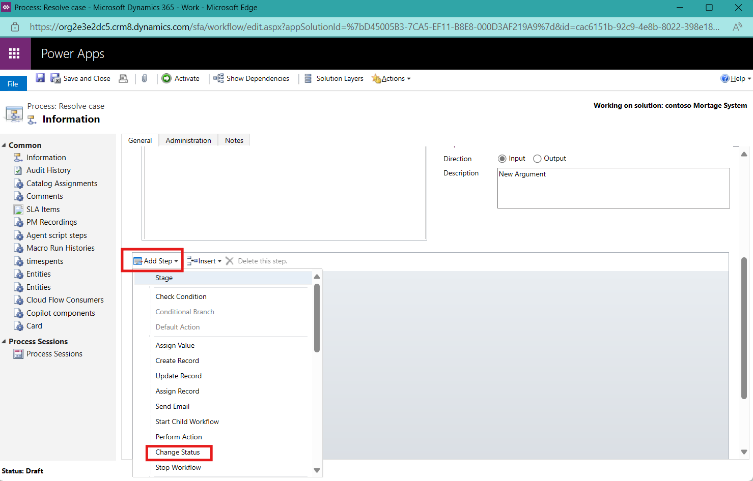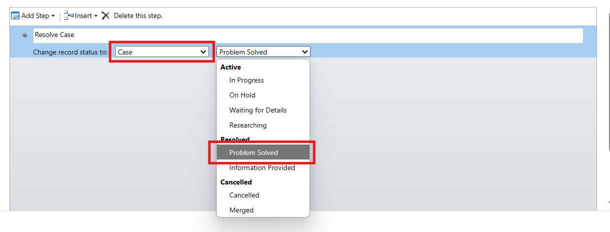 The next step is to add the change status feature. This step is straightforward; you only need to select the new status for the case. For this task, I will choose “Problem Solved.”