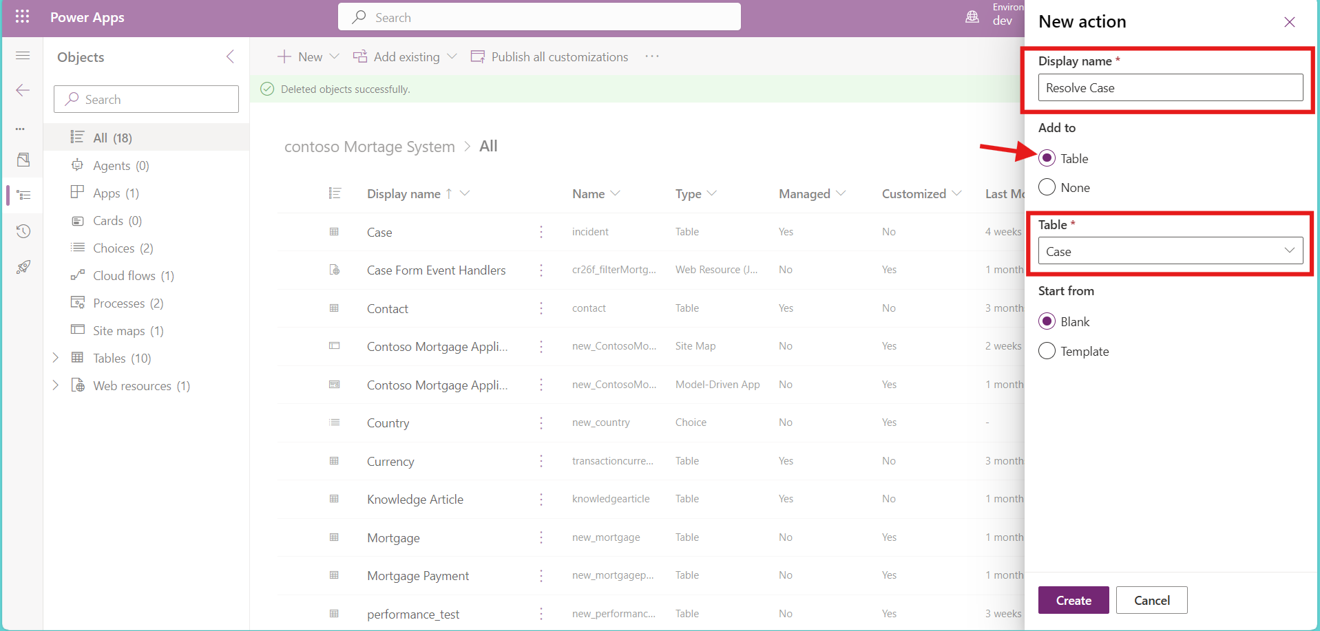 In the create action side drawer, fill in the required details such as the Display name. Ensure to check “Table” in Add to and “Case” as the Table. After this, click “Create.”