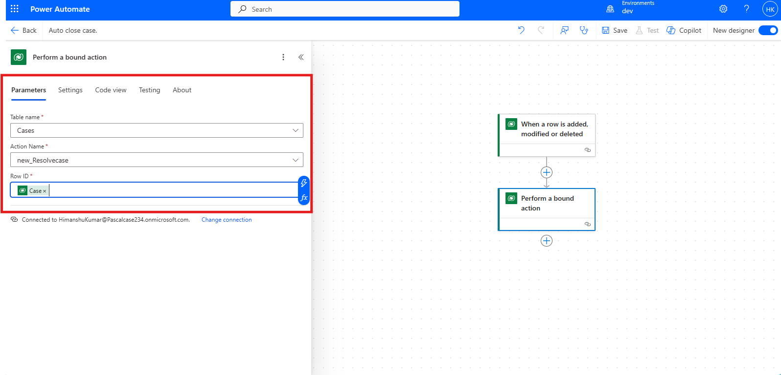 Next, click "Add" and choose another trigger as “Perform a bound action” from Dataverse. Select the Table Name as "Case" and choose the action that we created at the beginning. Pass the Case ID from dynamic values in Row ID.