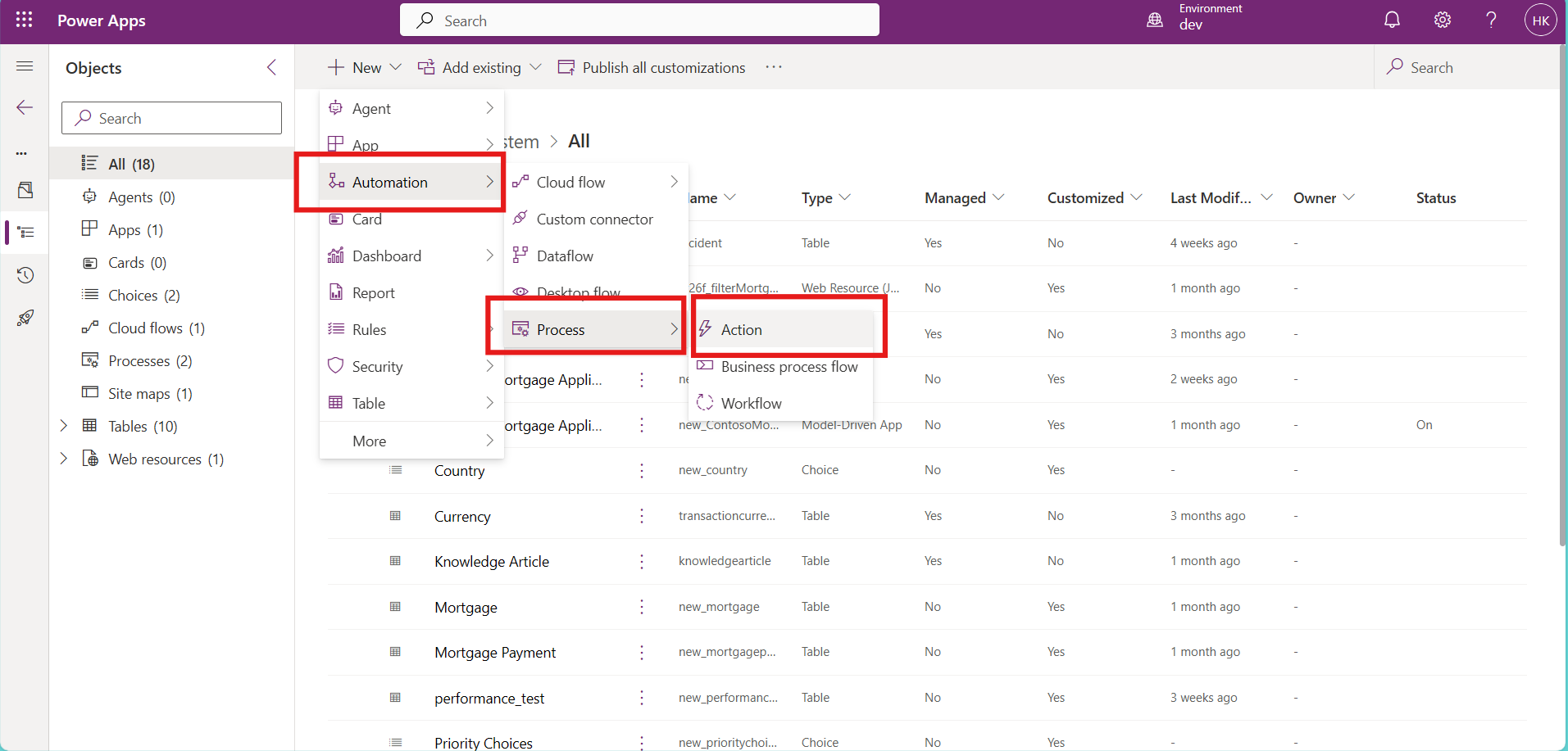 The first step is to open your solution, then click on new -> Automation -> Processes -> Action (Click on action)