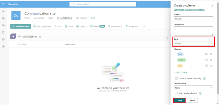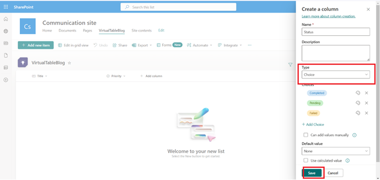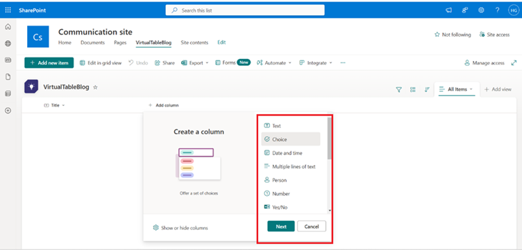Choose the column type from options like Text, Choice, Date and Time, Multiple lines of text, etc.