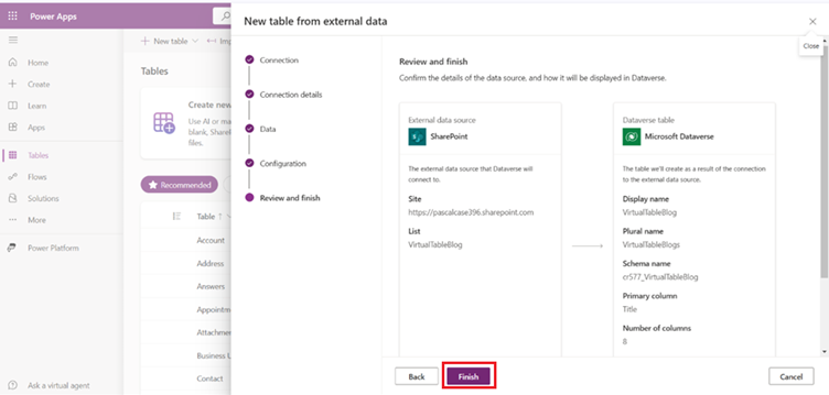 Finally, review the summary of the virtual table setup and click Finish to complete the process.