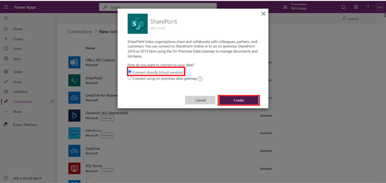 Select Connect directly, enter the SharePoint site URL, and authenticate using your credentials and click on create.