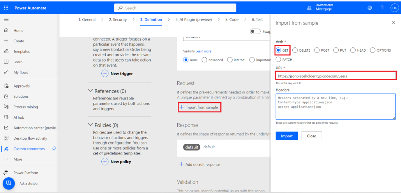In the Request section, click Import sample, choose the GET method, and provide the URL for the API endpoint.