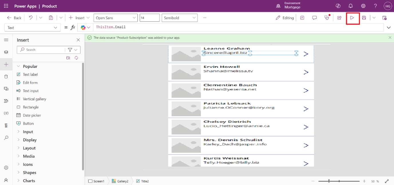 In the top right corner of Power Apps Studio, click on the Preview icon to run your app.