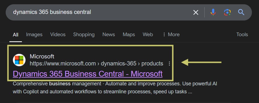 Search for “Dynamics 365 Business Central” on your browser and click on the first official link from Microsoft, as shown in the figure below.
