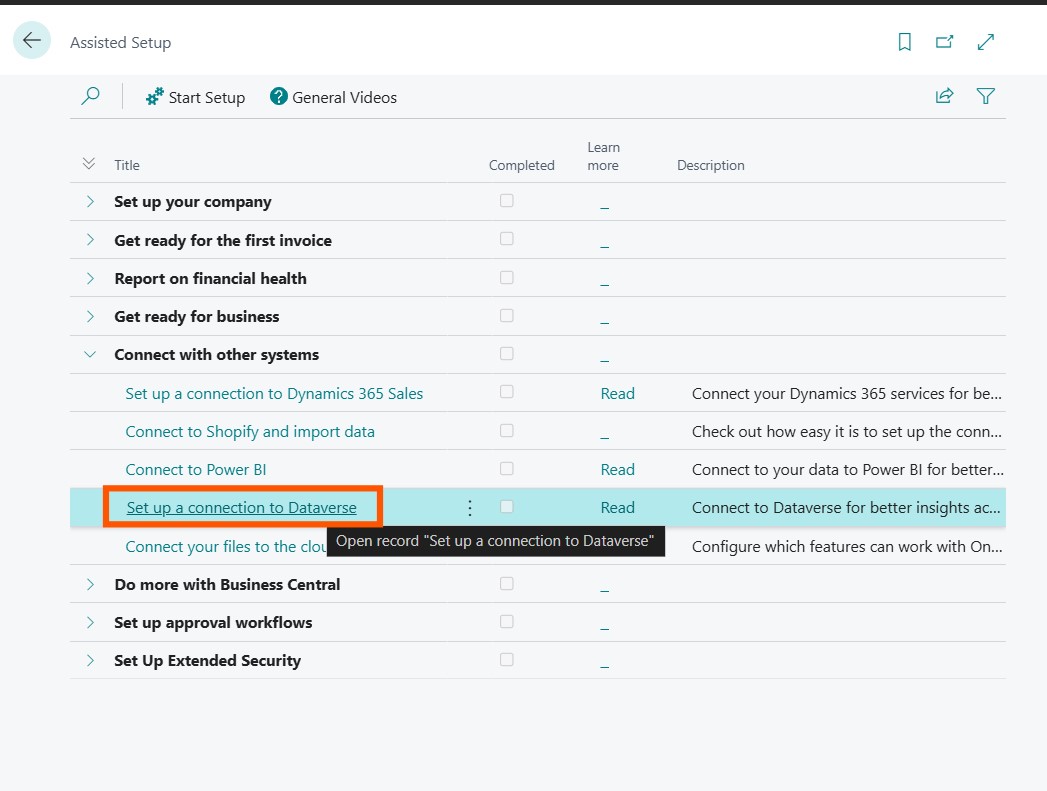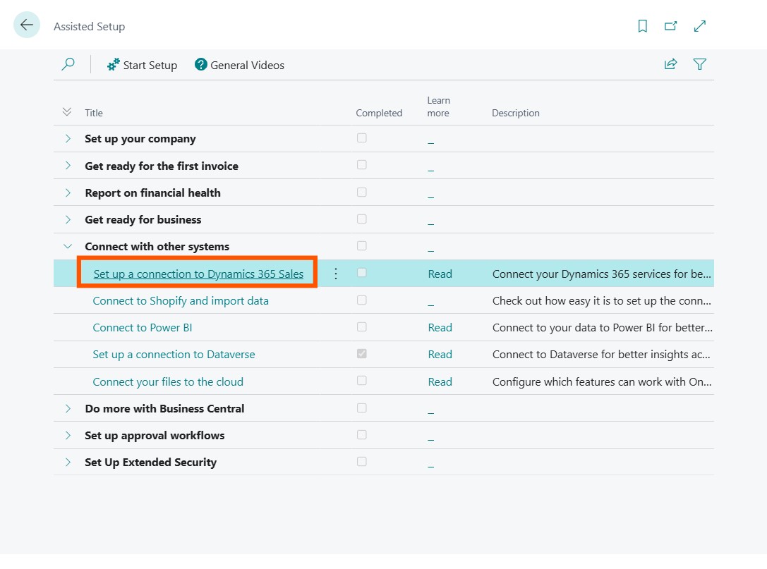 Return to Assisted Setup (from the steps shown above) and select Set up a connection to Dynamics 365 Sales.
