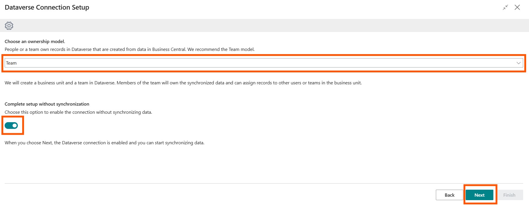 Choose Ownership, enable setup without synchronization, and click on Next.