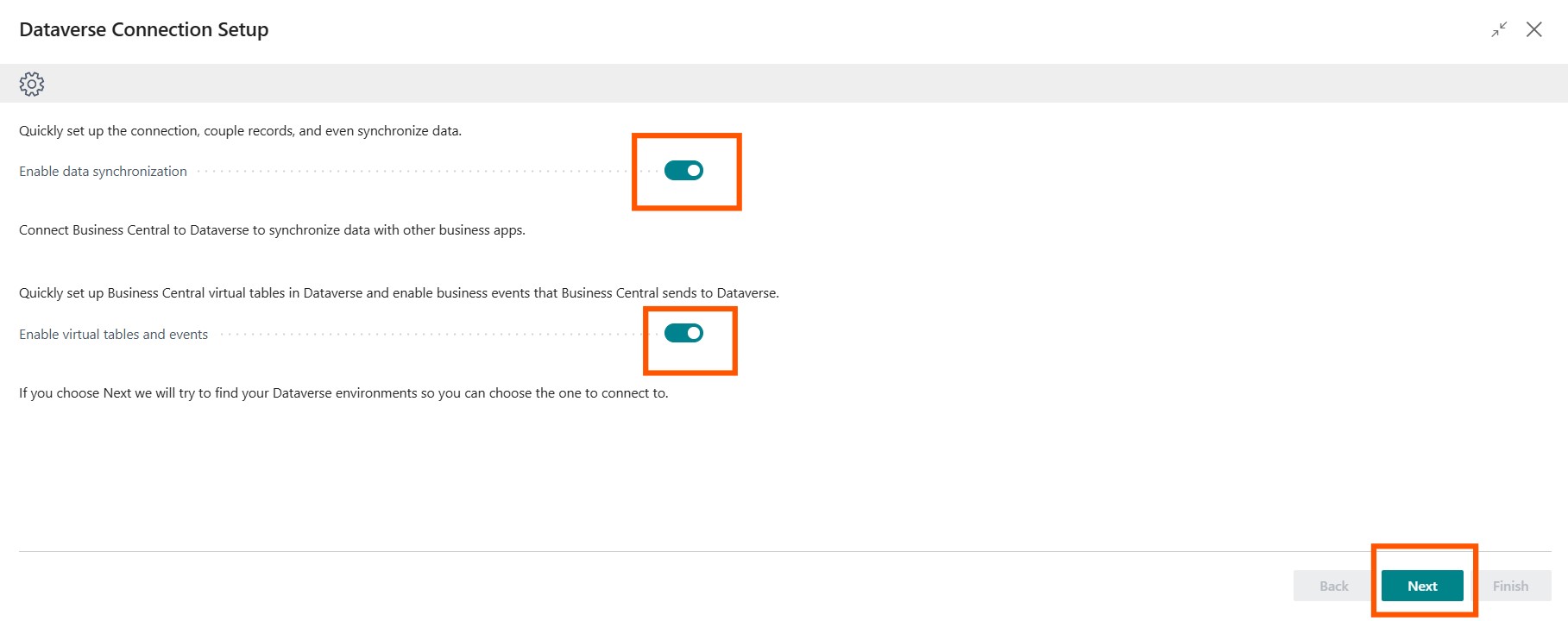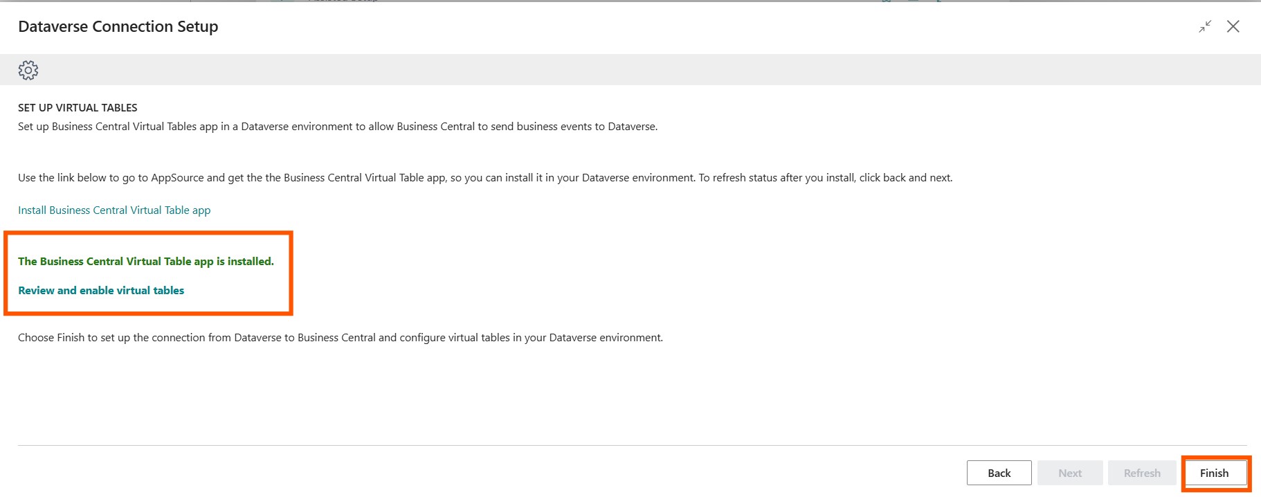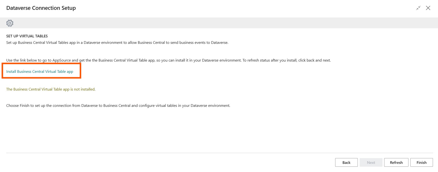 If you have not installed the Business Central Virtual Table app, you can do so now by following the wizard. Once you have done so, click on Refresh or go back and click on Next.