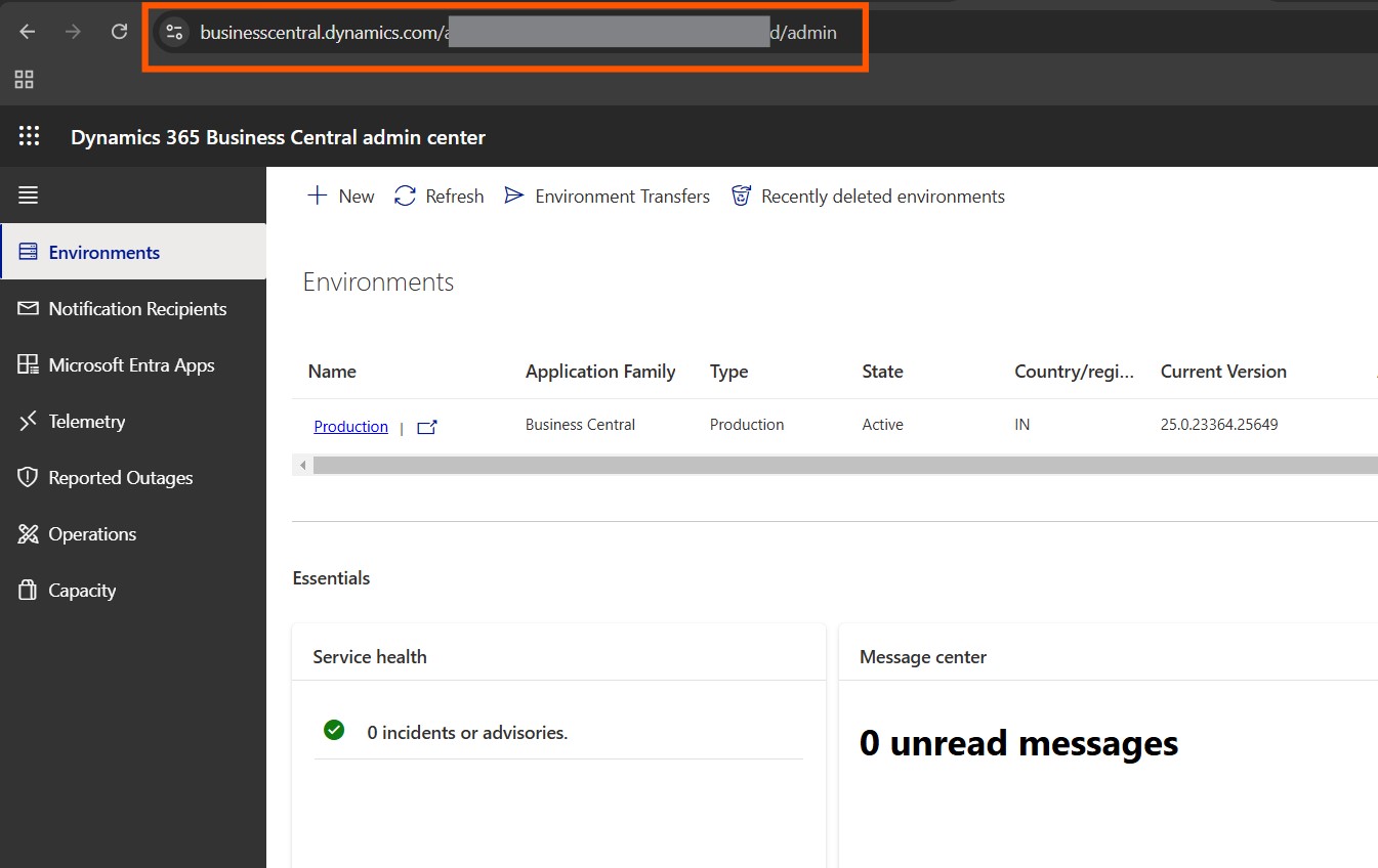 You can access the admin center for Business Central using your tenant ID at: https://businesscentral.dynamics.com/<tenantID>/admin.