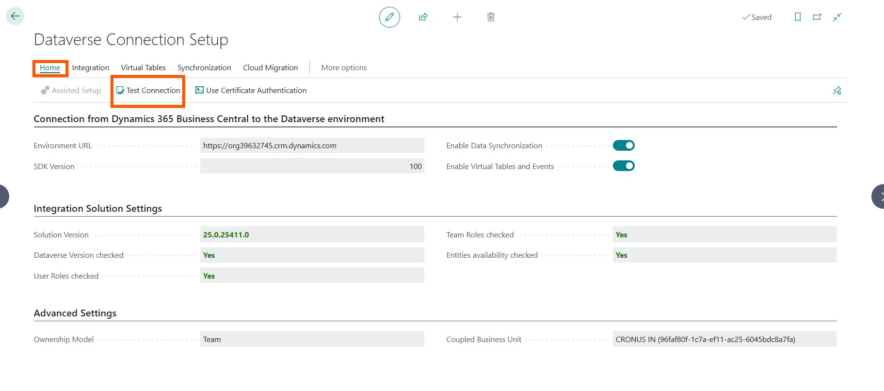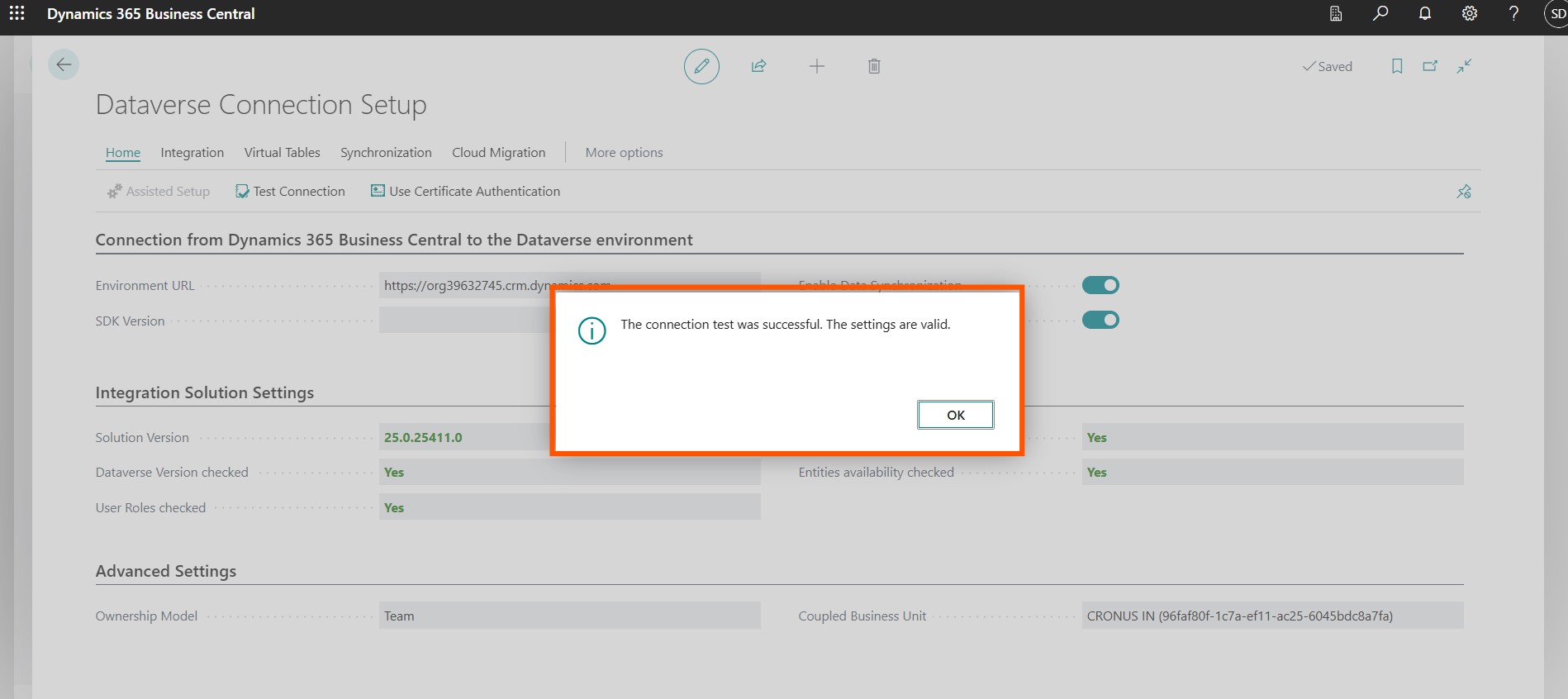 On the homepage, search for Dynamics 365 Connection Setup and test the connection. Synchronize data, and the integration is complete.