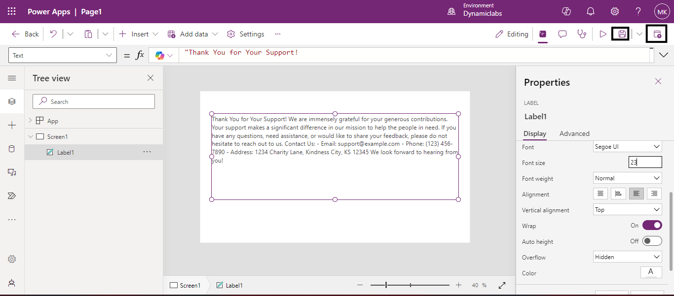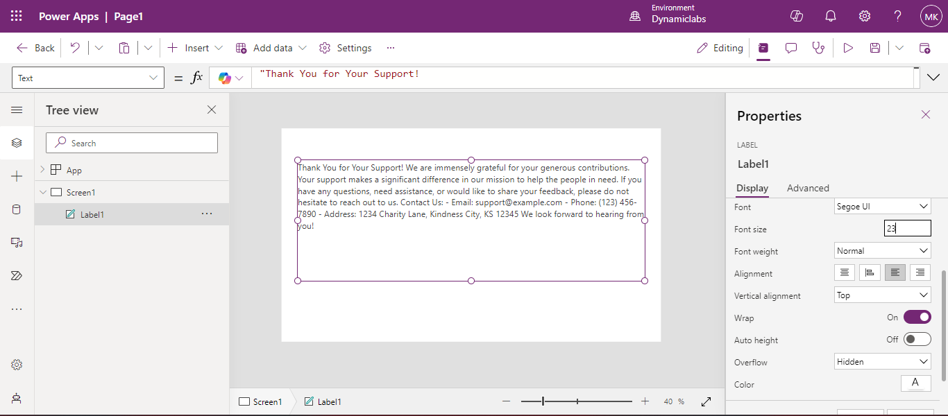 Enter text in the label. For example, here, I have entered information related to a thank you note to the contributors for the donations given for a cause.