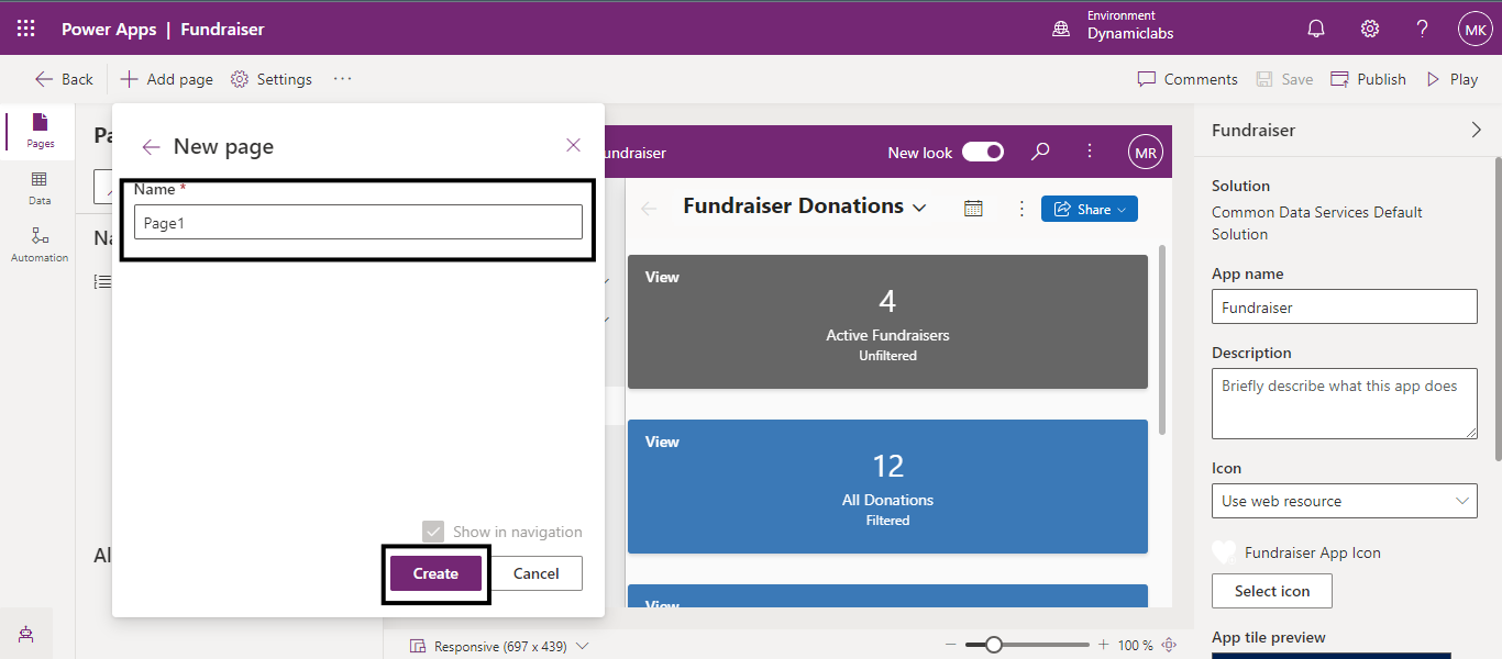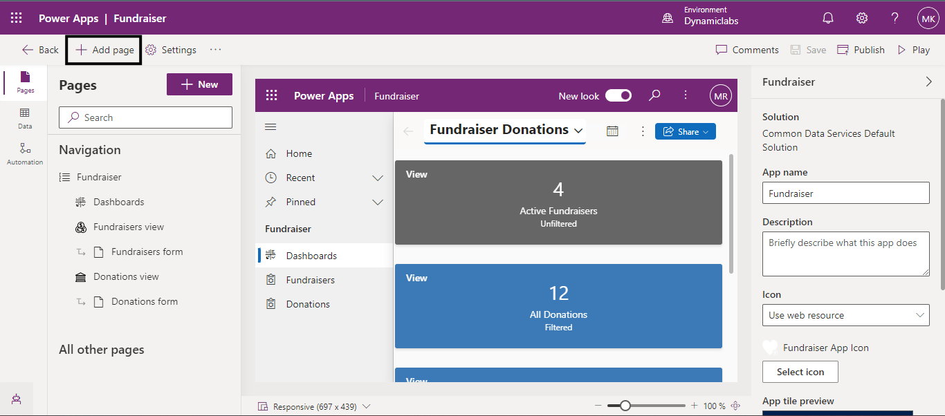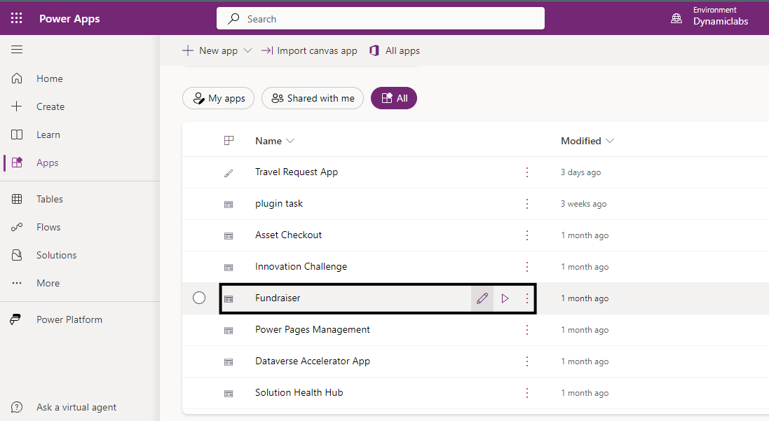 Choose a model-driven app. Here, I am selecting Fundraiser app. This app displays the details of Donations, Donors, and Fundraisers of an organization or a charity.