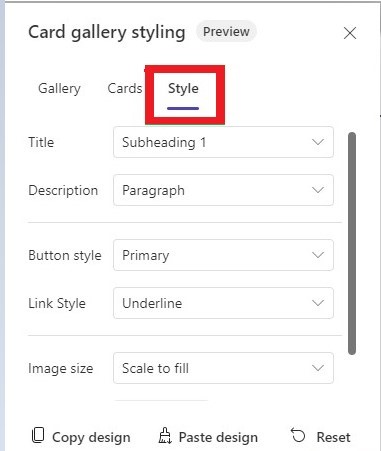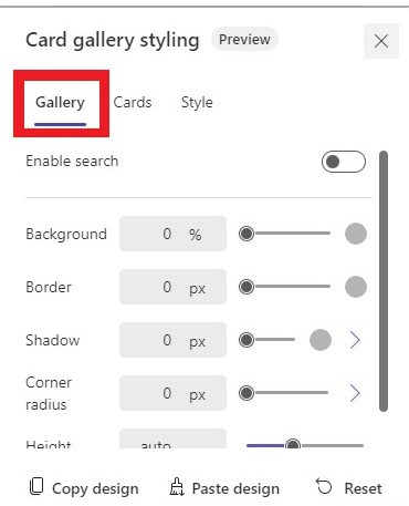 After clicking the Styling button, a window will appear with three tabs: Gallery, Cards, and Style.