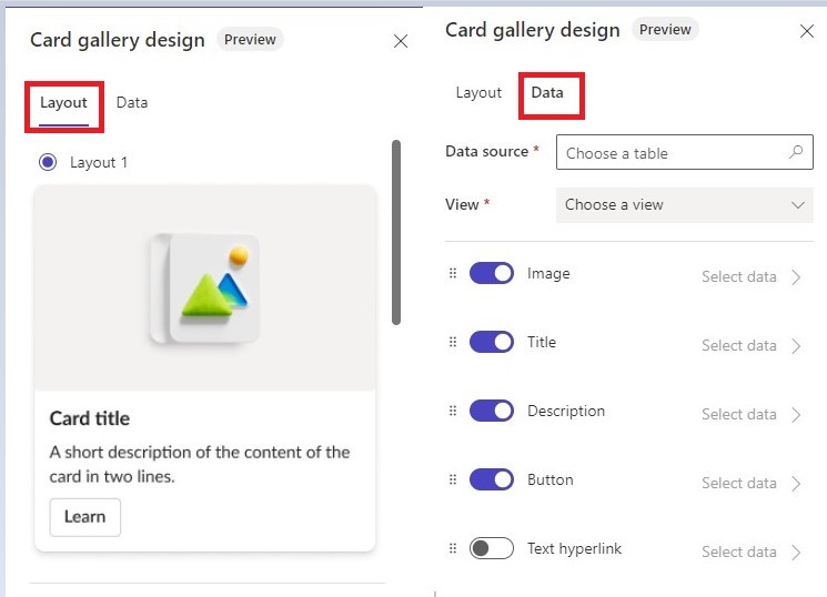 The "Data" tab acts as the control centre for configuring the content displayed in the Card Gallery. In this section, users can specify the data source and choose which fields to show on the cards. By utilizing this tab, users can ensure that only relevant and essential information is highlighted, thereby enhancing the overall user experience.