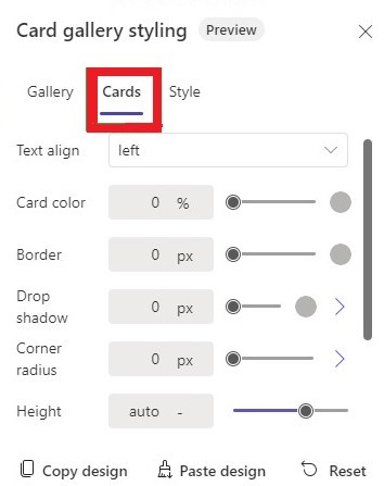 These buttons offer convenience for users managing multiple card galleries on the website. Users can design one card gallery, copy the design, and effortlessly paste it onto another gallery, removing the need to manually apply the design to each gallery.