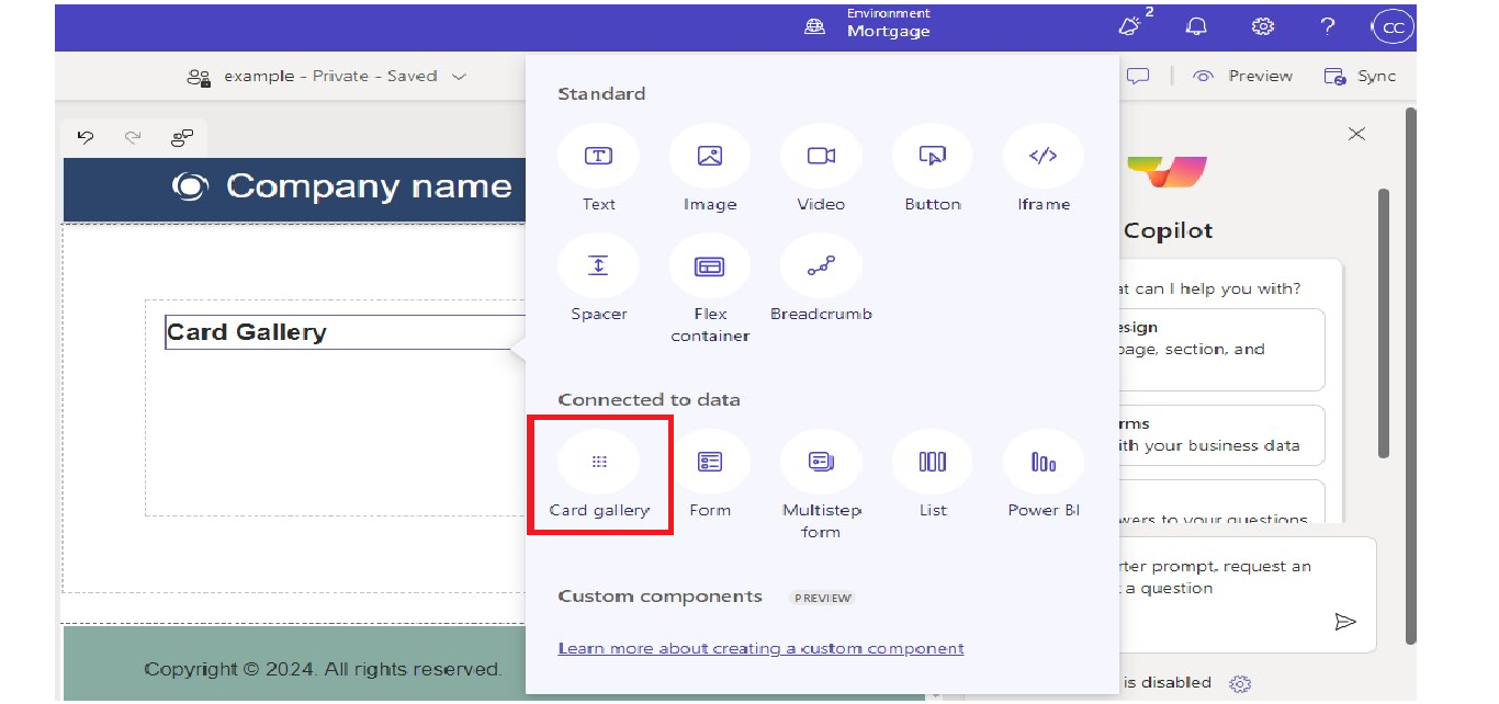 1. After navigating to the Power Page site at you'll be presented with a variety of components to choose from. To insert the Card Gallery into your webpage, simply select the "Card Gallery" option and place it in the desired section of your site.