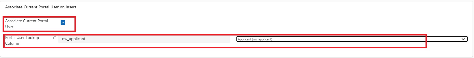 Scroll down a little. Go to Associate Current Portal User on Insert Section and Enable Associated Current Portal User Option and Select the Contact Lookup from the column Dropdown.