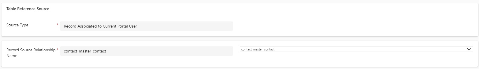 In Table Reference source sub grid, select Source Type as Record Associated to current Portal User and in Record Source Relationship name select Master ID from drop down.