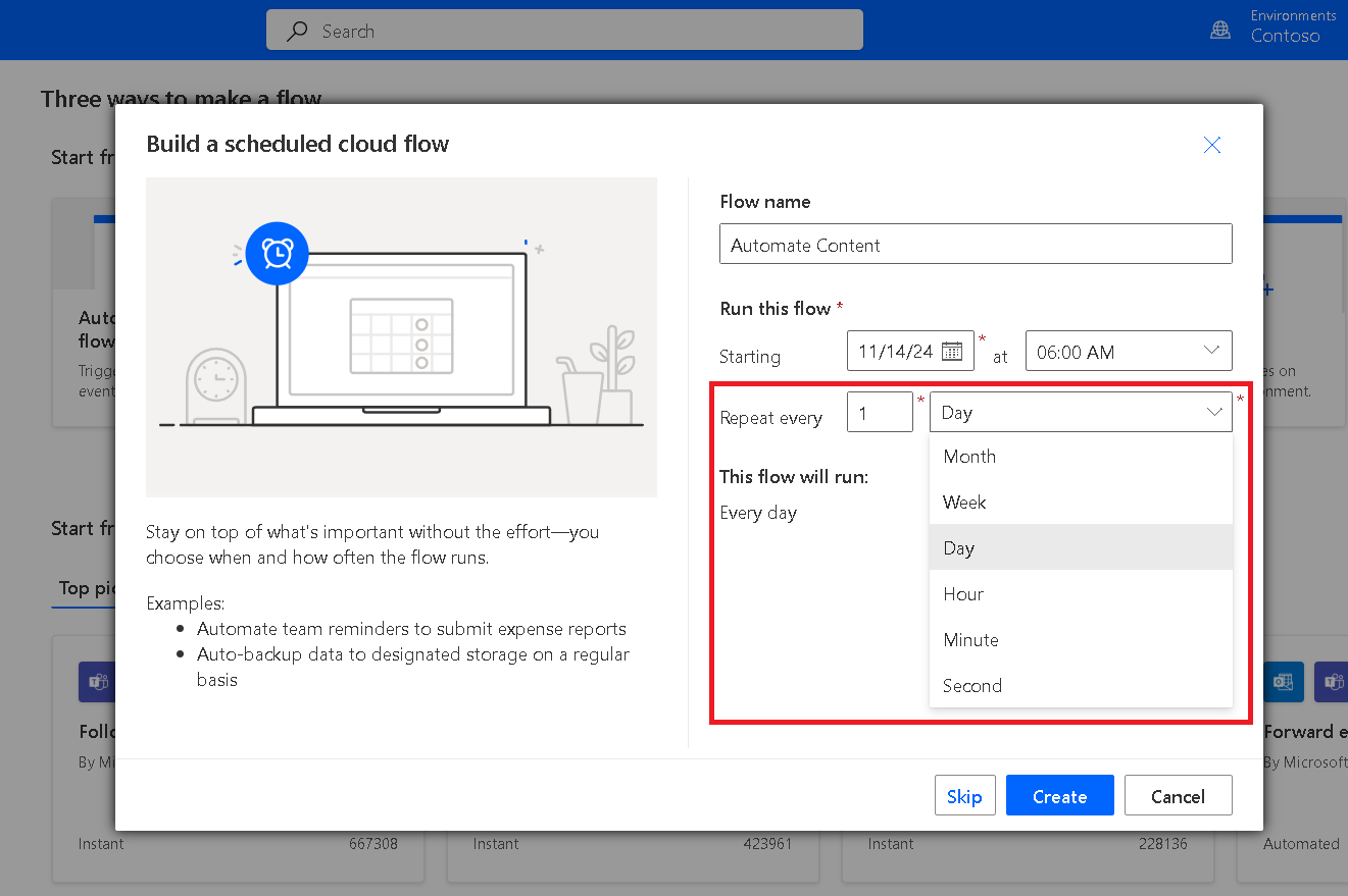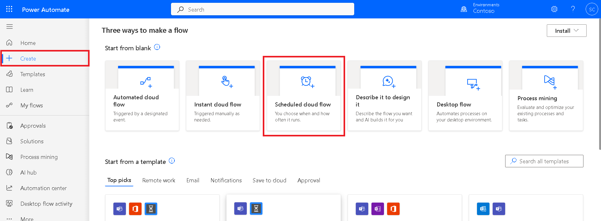 1. Open Power Automate, click on 'Create', and then select 'Scheduled Flow'.