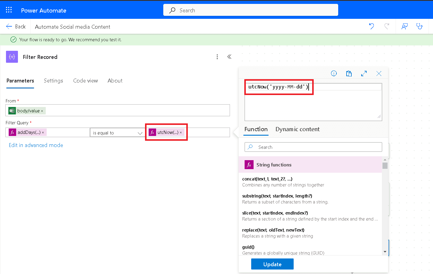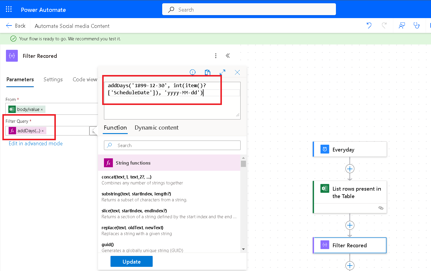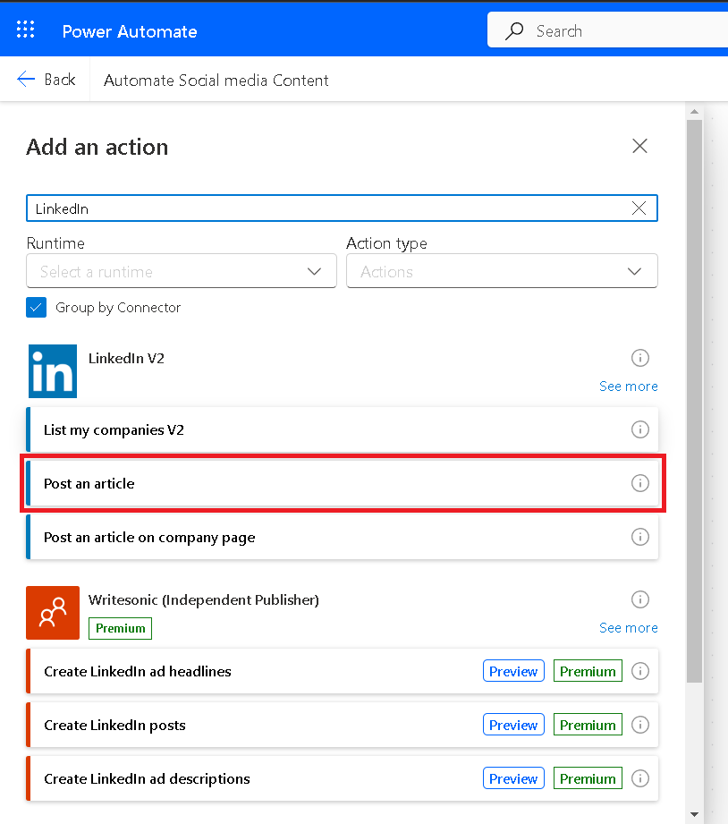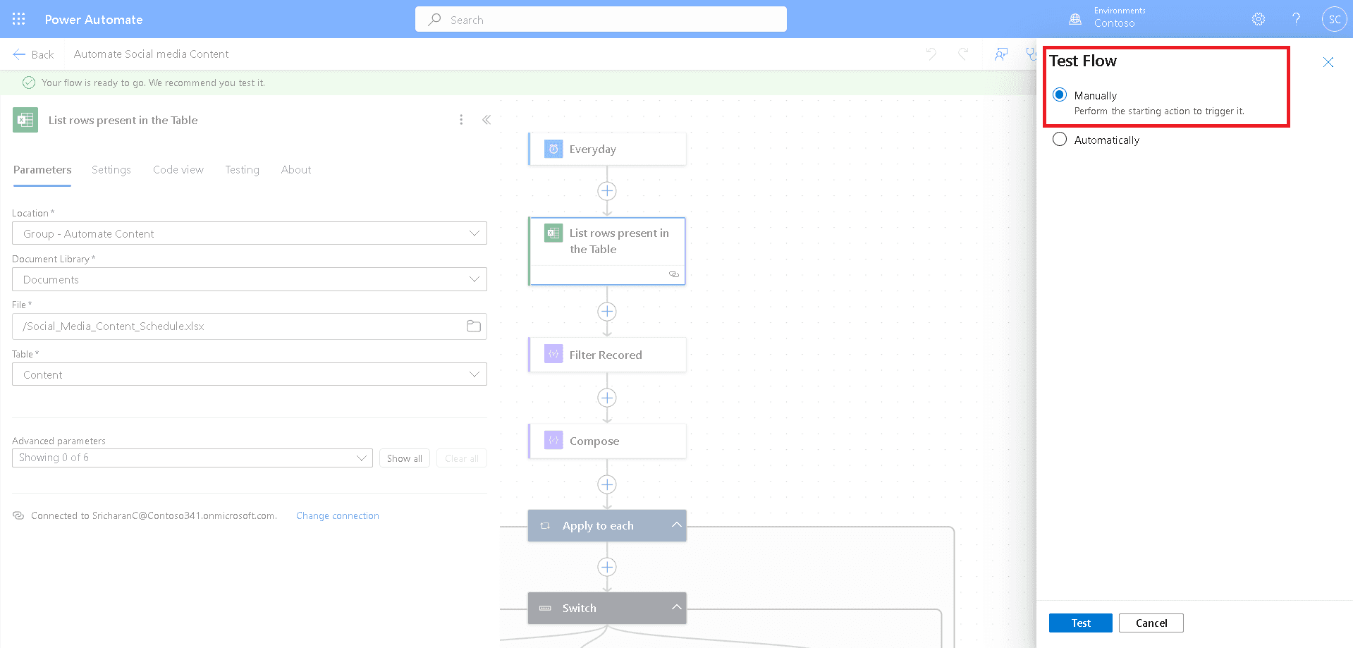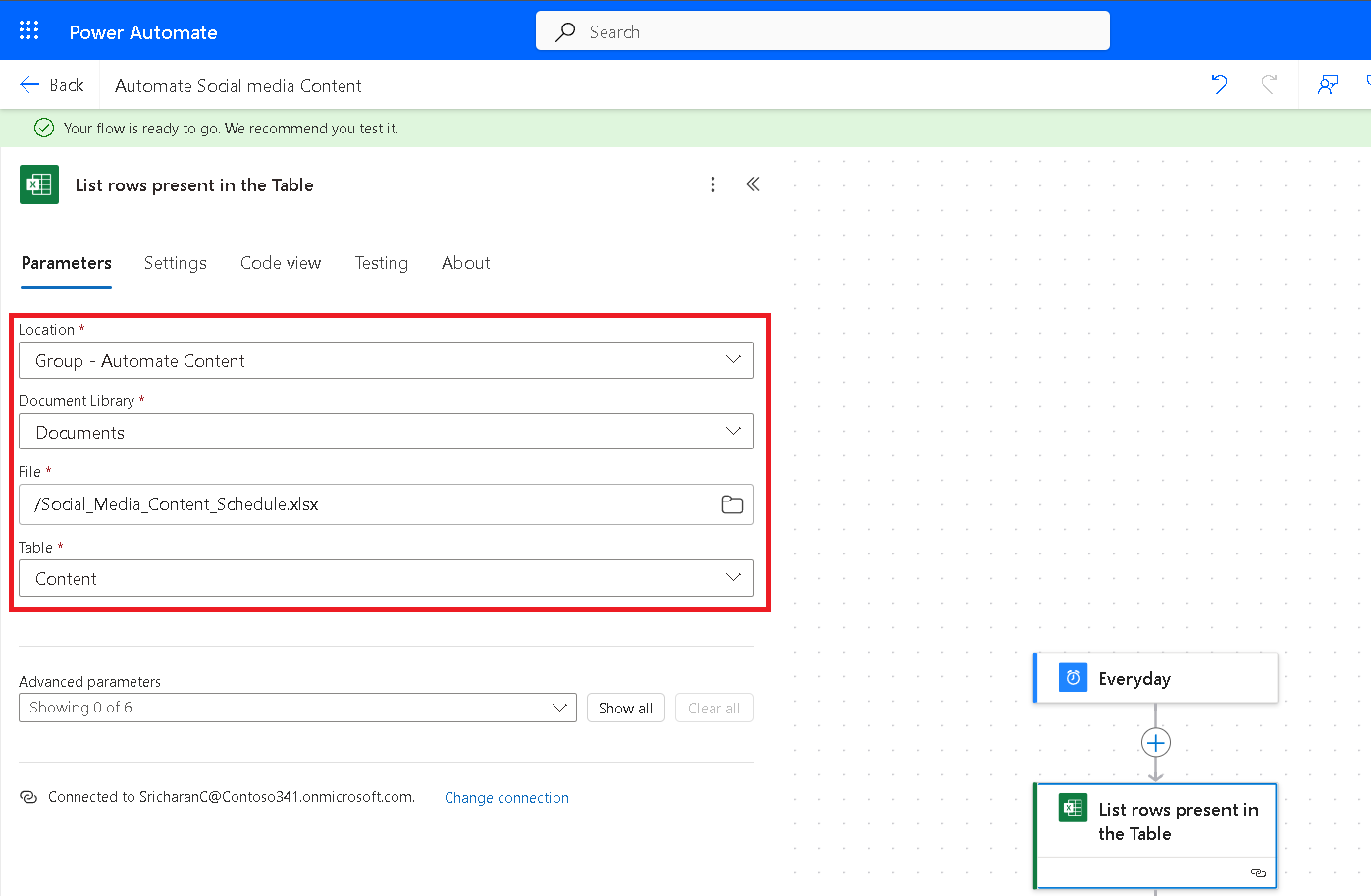 In this example, we will demonstrate the automation of posts on Twitter and LinkedIn utilizing a list contained in an Excel spreadsheet stored in SharePoint.