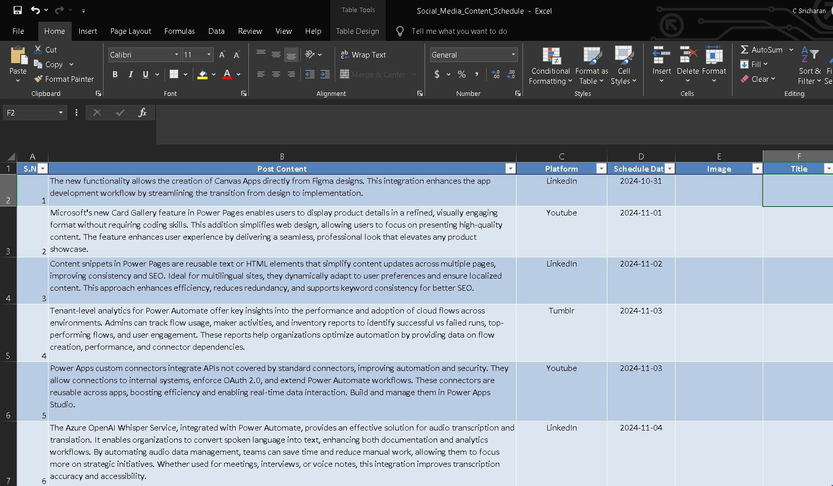 1. Create an Excel file with columns such as Title, Post Content, Platform, Schedule Date, and Image per your requirements.