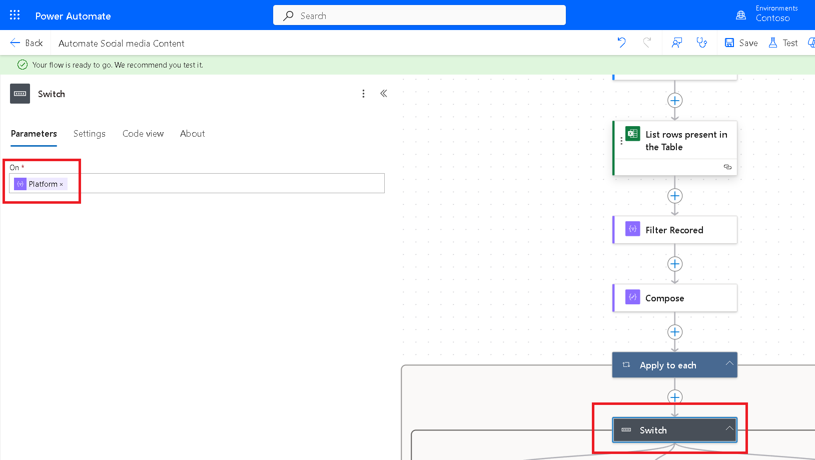 Test the flow manually to verify that each case posts correctly to the right platform.