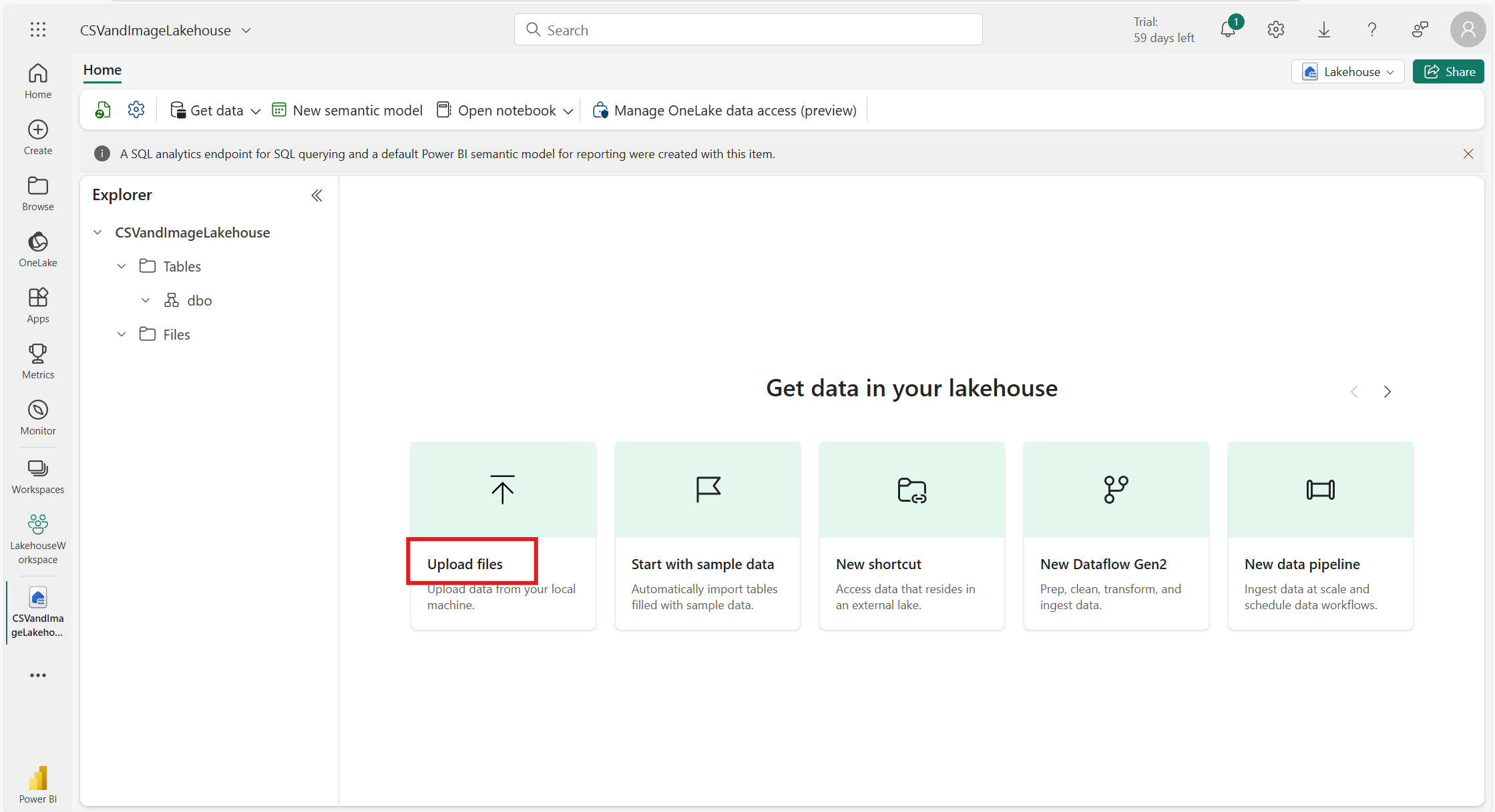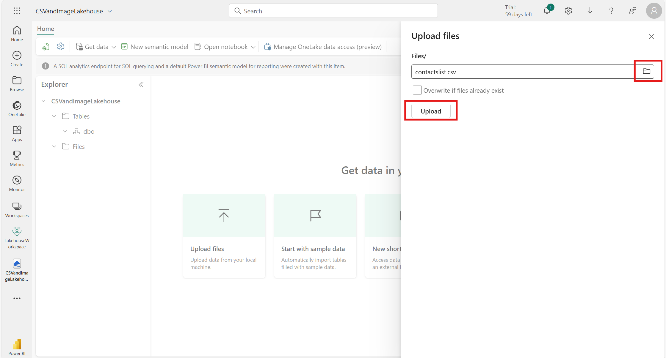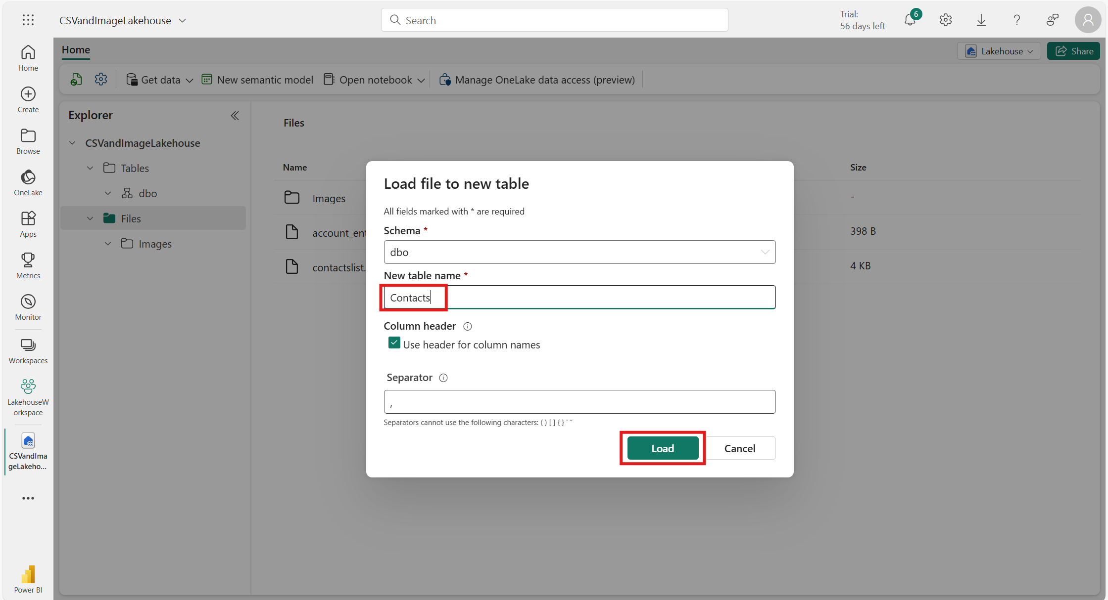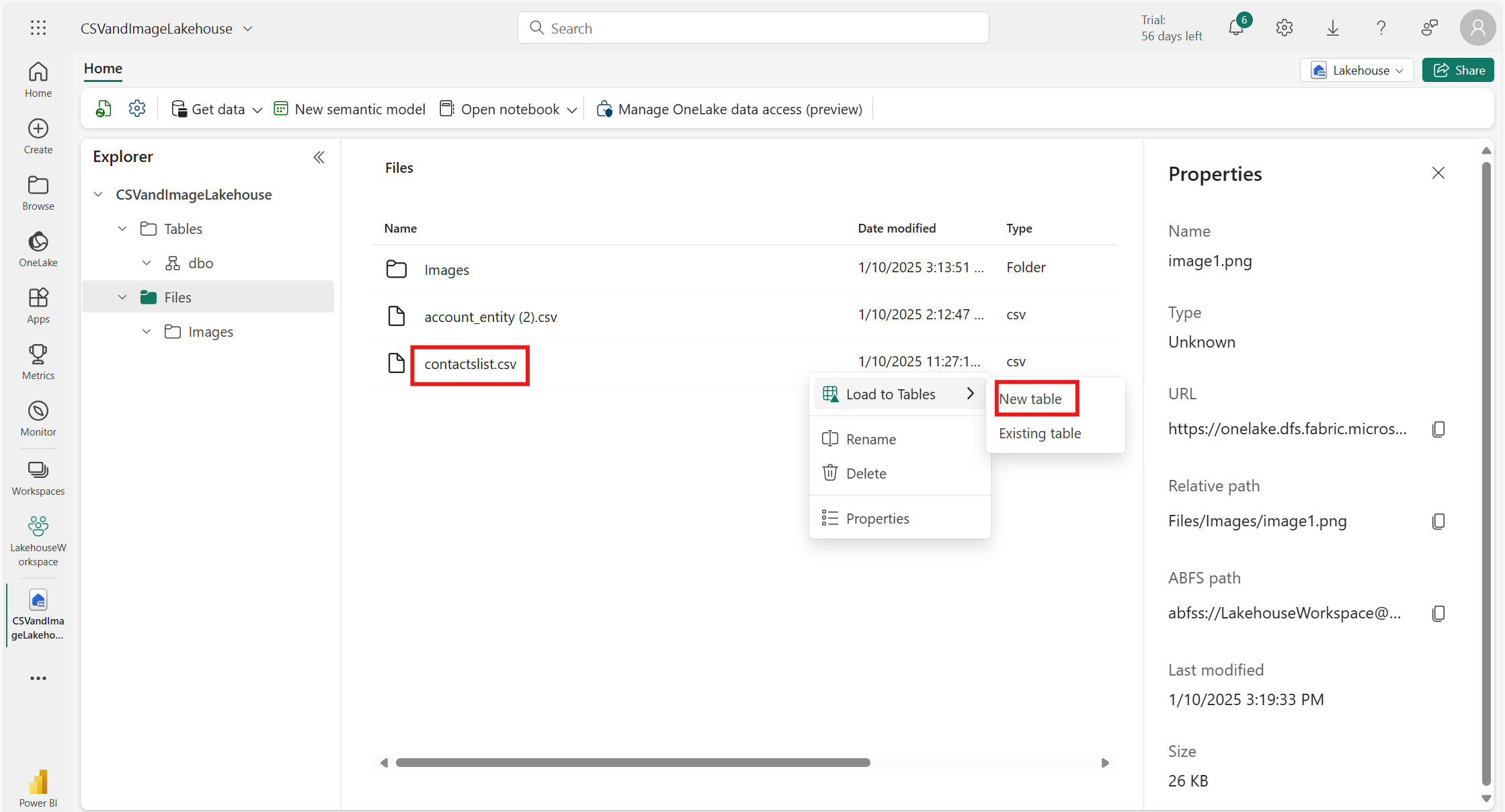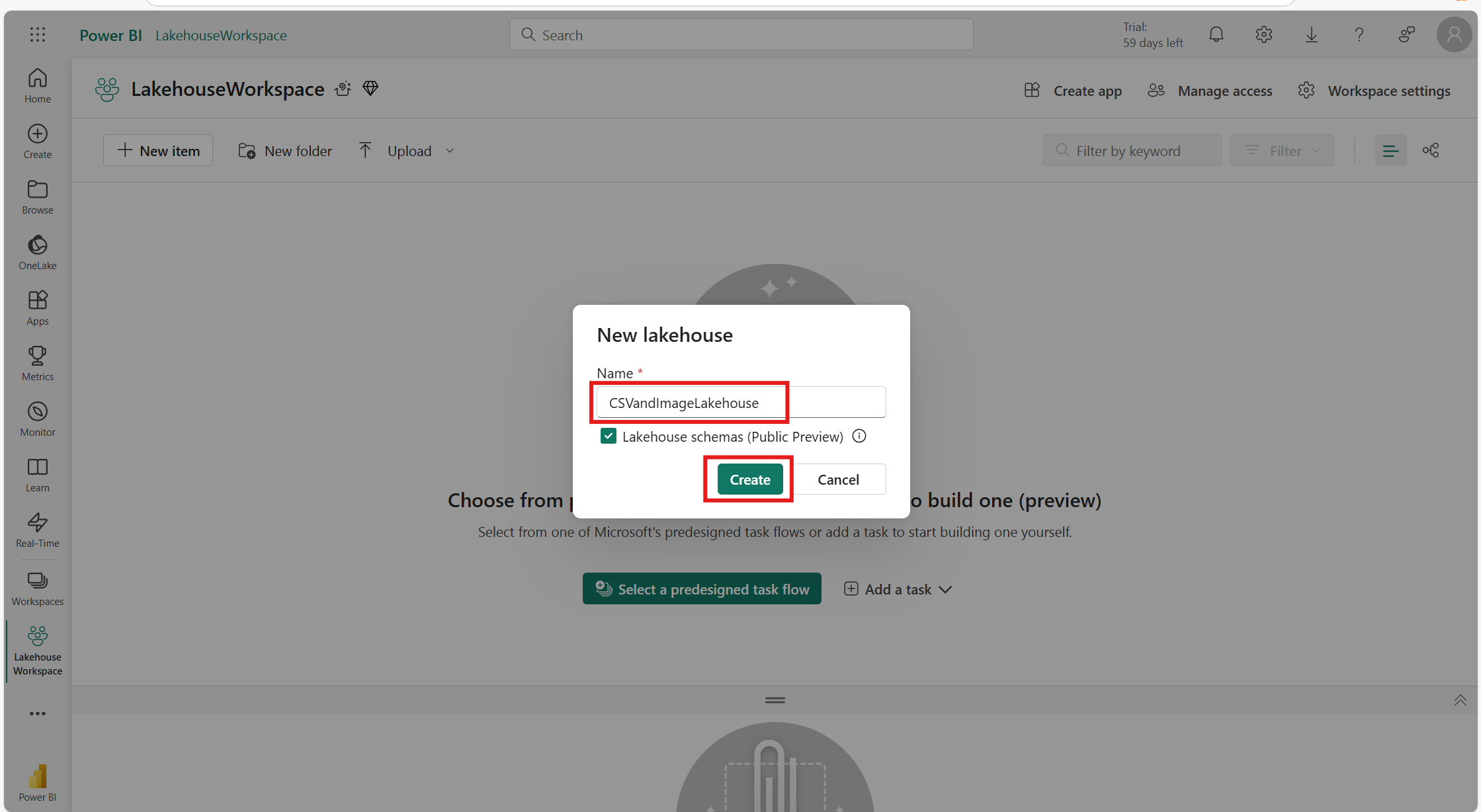 Provide a name for your lakehouse (e.g., CSVandImageLakehouse) and click Create.