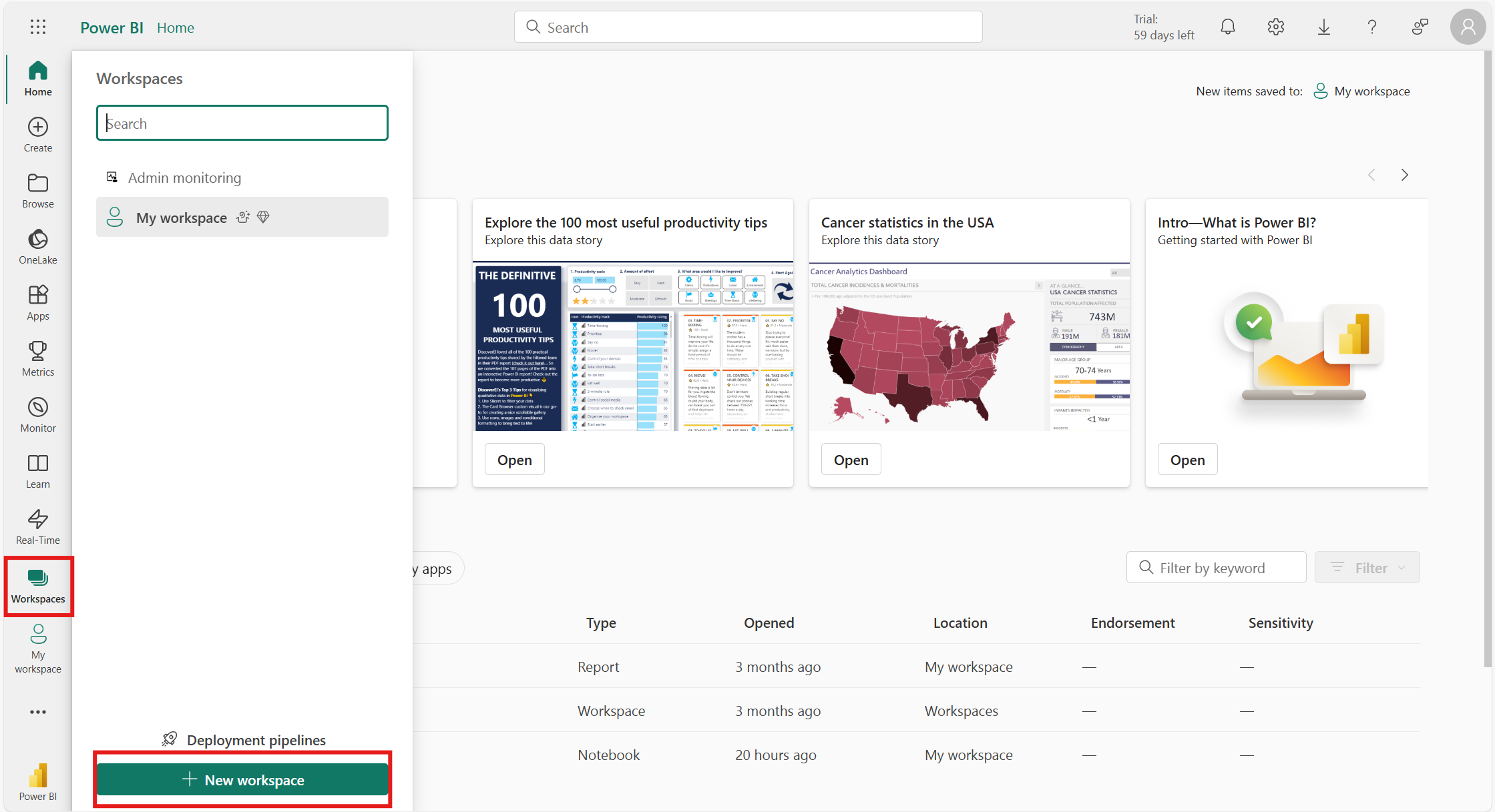 Navigate to the Workspaces section in the left pane and click new workspace.
