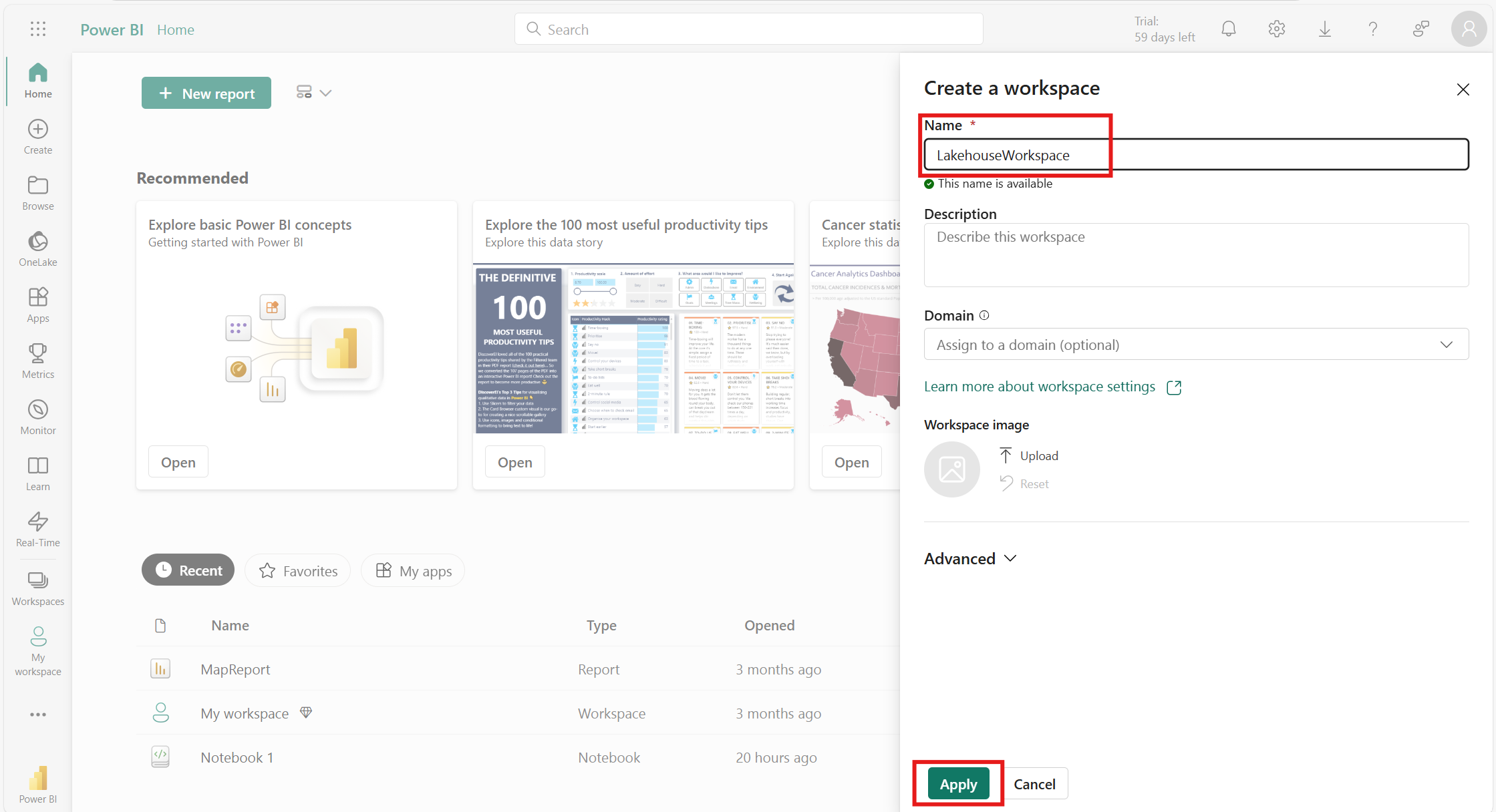 Enter a name for the workspace (e.g., LakehouseWorkspace) and then click Apply.