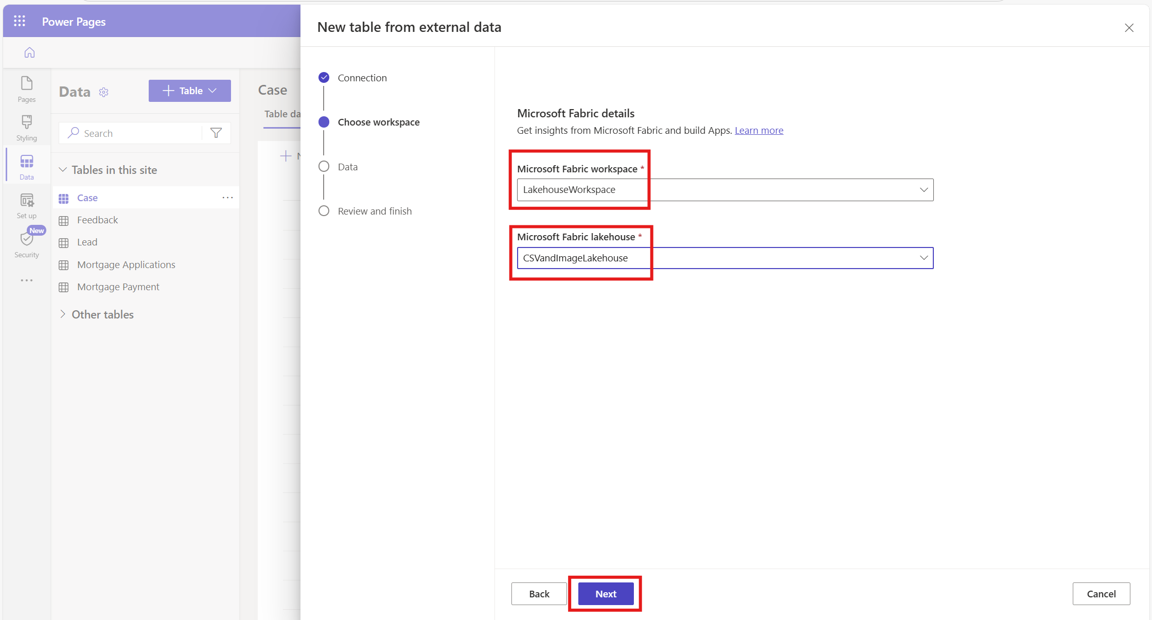 Cross-region integration between Power BI and Power Apps is not supported. You will encounter errors while connecting the lakehouse to Power Pages. Ensure both resources are created in the same region.