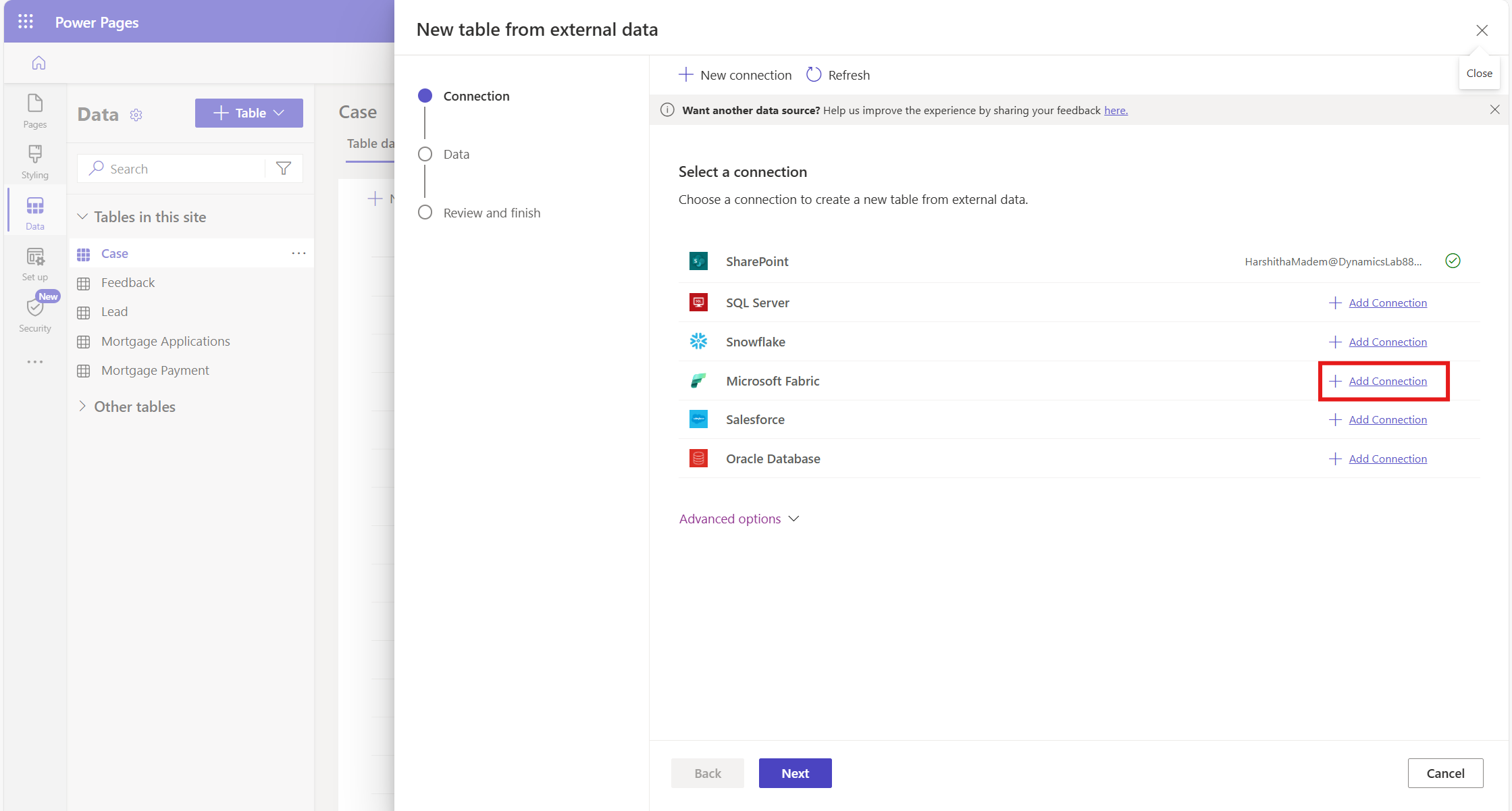 Select Microsoft Fabric as the data source and click on Add Connection to connect with your Microsoft Fabric account.