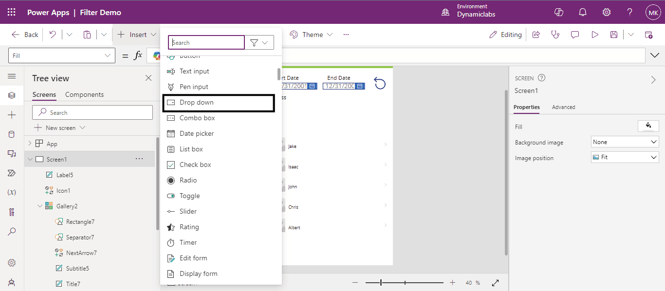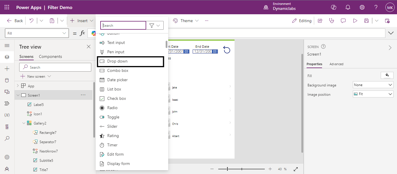 Now pick the dropdown option from the insert menu which will act as a choice field, and we are going to apply filter on that.