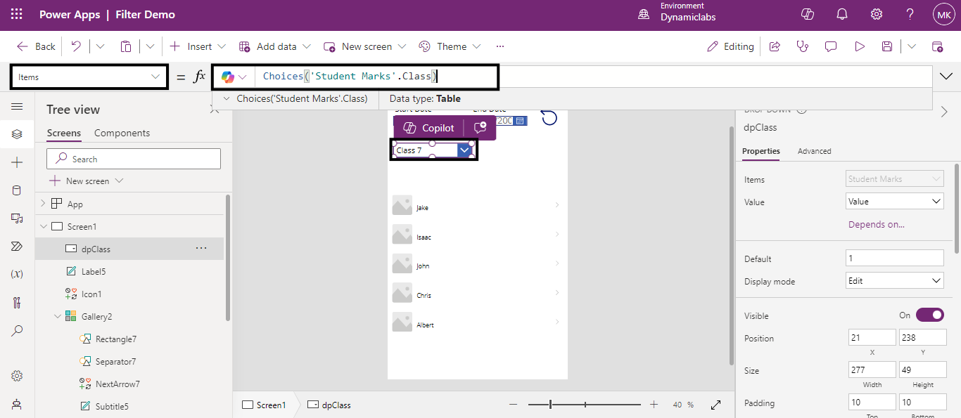 Now to make filters work, go to the items property of the gallery, and write a formula using the filter function.