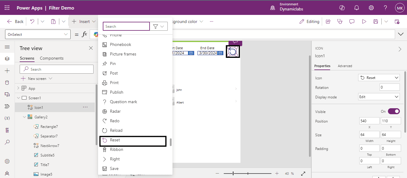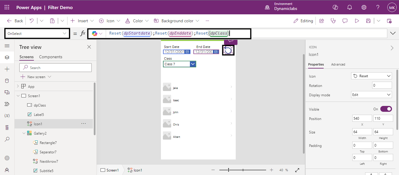 Now to reset the filters, we need to activate the filter button. This involves writing a formula for the 'OnSelect' property of the reset button.