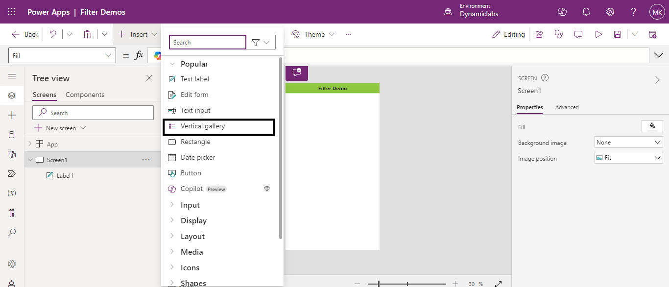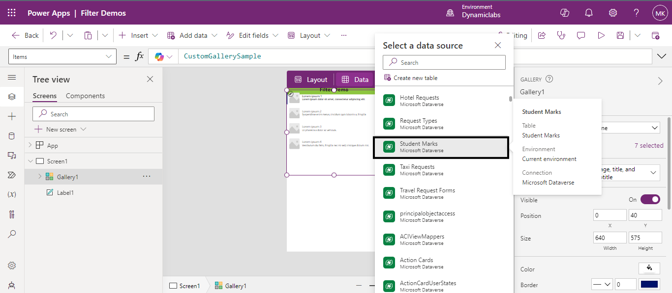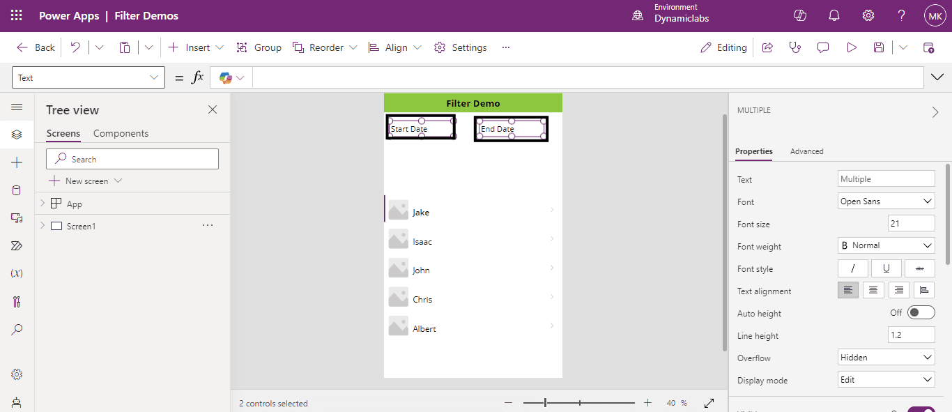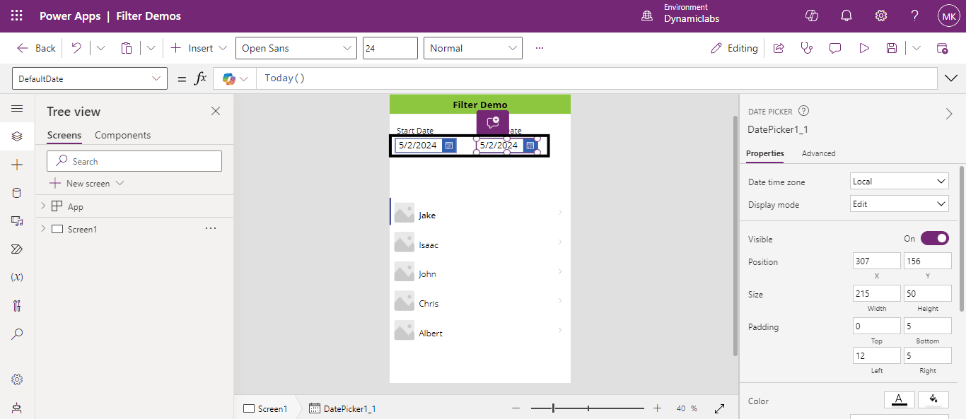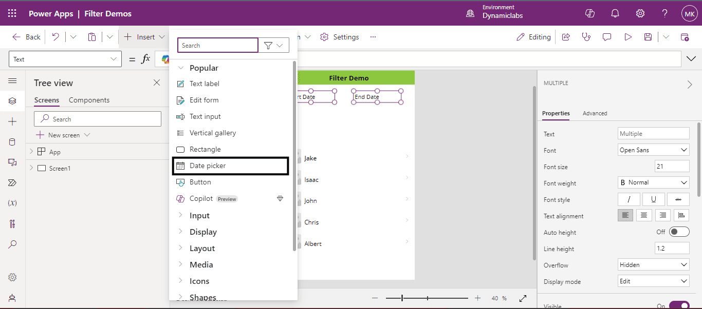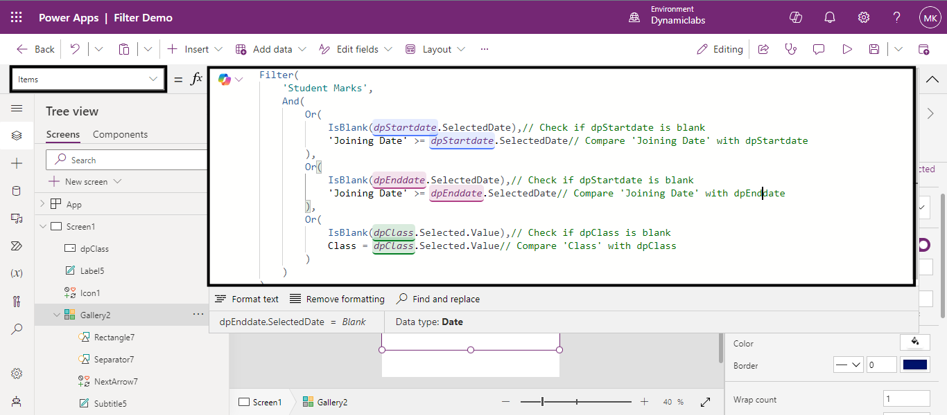 After connecting it to the data source, we try to create and apply filters for our canvas app. Since my data source consists of a date column and a choice column, I want to create filters using them.