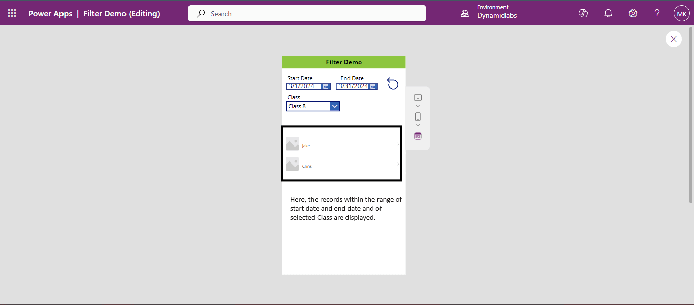 Preview the app, and let’s see how our filters work. So, here, we selected the date range and choice from the drop-down, and the records that match that date range and choice are filtered.