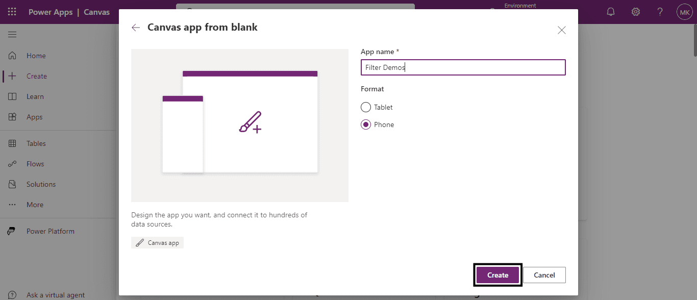 Firstly, log in to Power Apps, and create a canvas app, you can either select Tablet or Phone format. Here, I am selecting Phone.