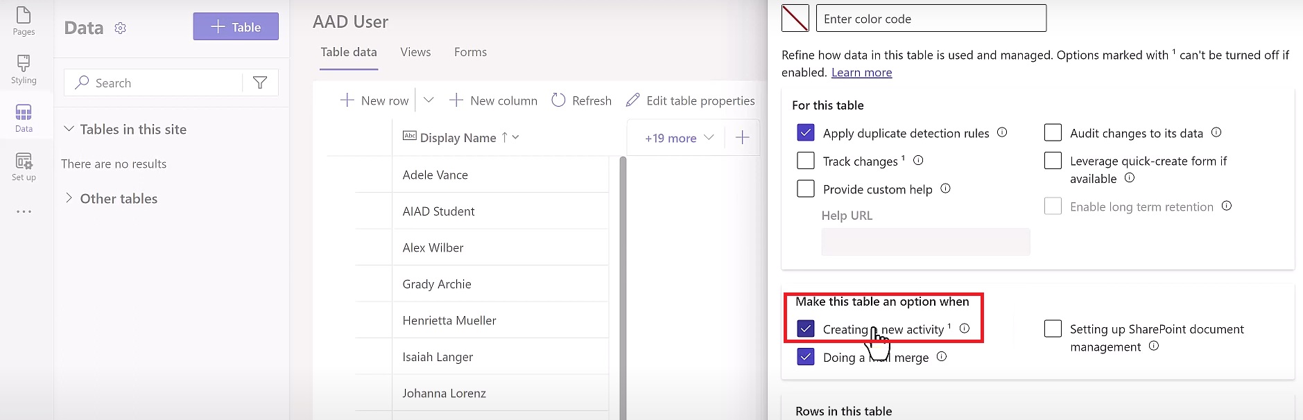 Note -: When you create a Table, enable Creating a New Activity feature in Advanced Settings.