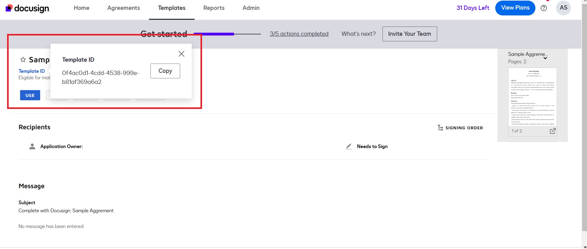 Copy the Template ID. We will use it later. Go to Template -> Click on Template ID -> Click on Copy