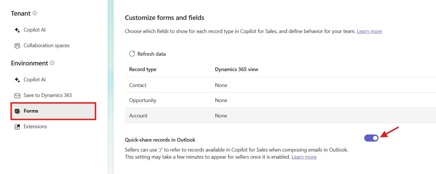 Go to Forms in same admin settings and enable Quick share records in Outlook.