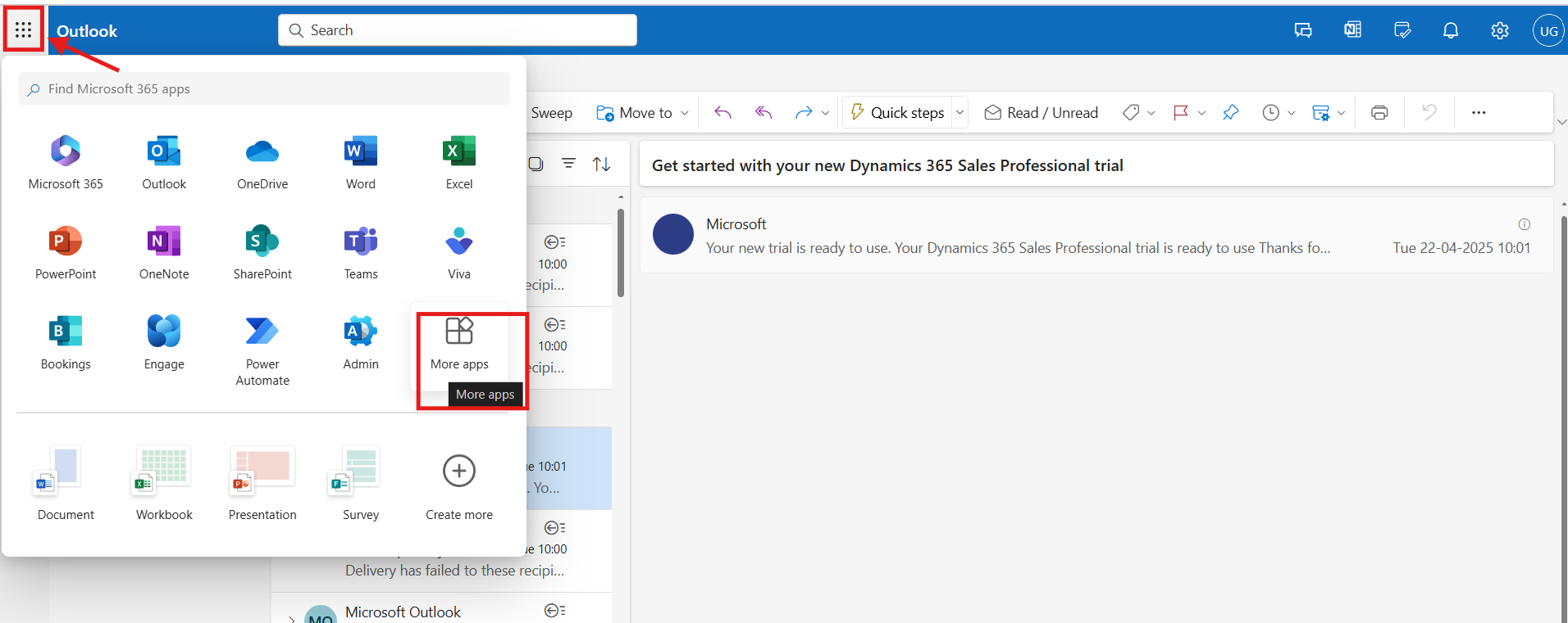 In Outlook, click the “More Apps” icon (nine-dot grid) at the bottom-left