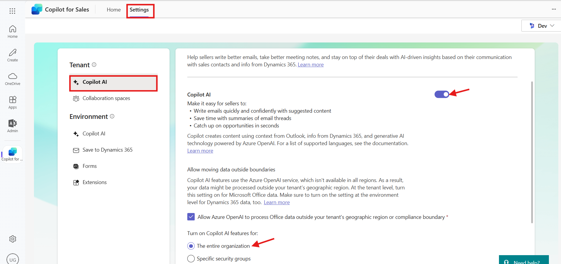 Go to Settings > Copilot AI > Enable Copilot AI > Turn on Copilot AI features for the entire organization.