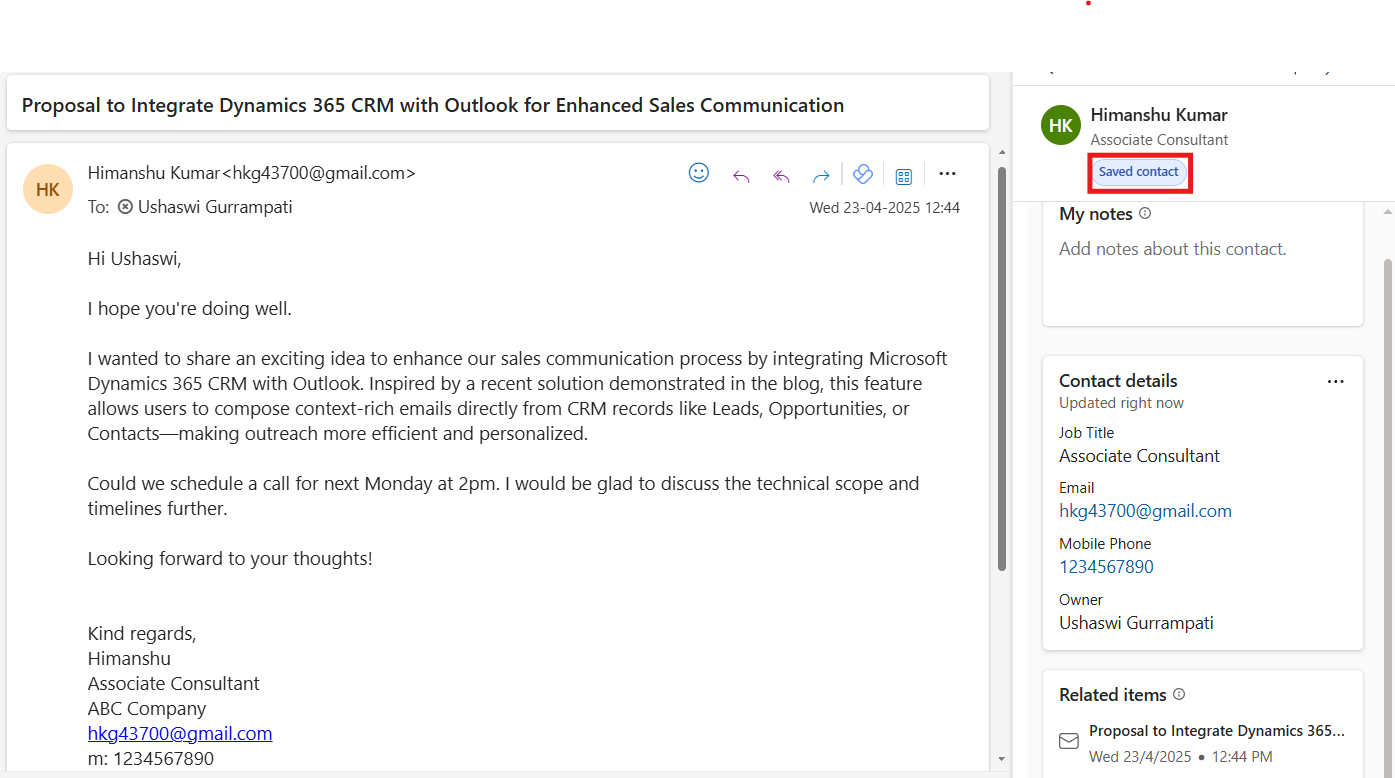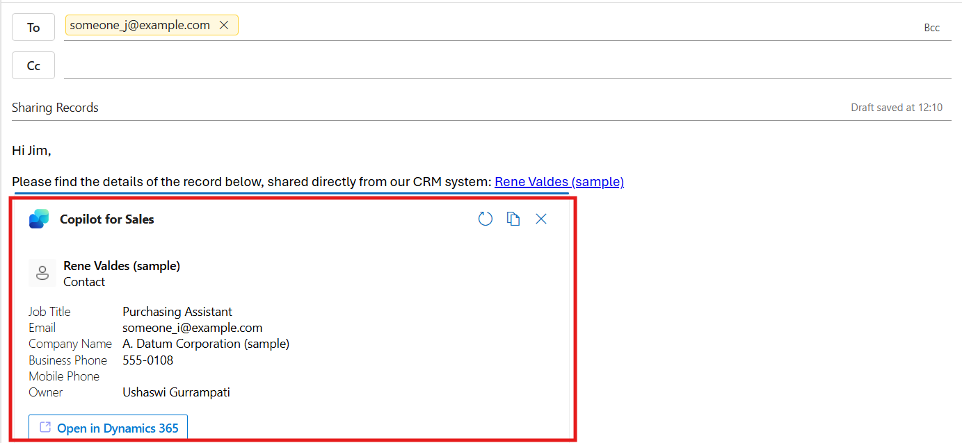 The integration of Copilot for Sales with Dynamics 365 in Outlook simplifies daily tasks for sales teams by bringing CRM data right into their inbox. It enables quick access to recent records, easy sharing of information, and seamless contact management.