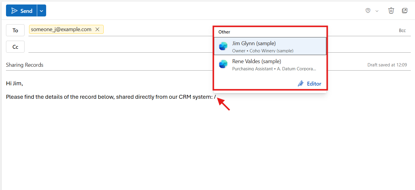 Create a new mail in outlook and type a forward slash ( / ) in the email body, and you'll see a list of relevant records from your CRM system.